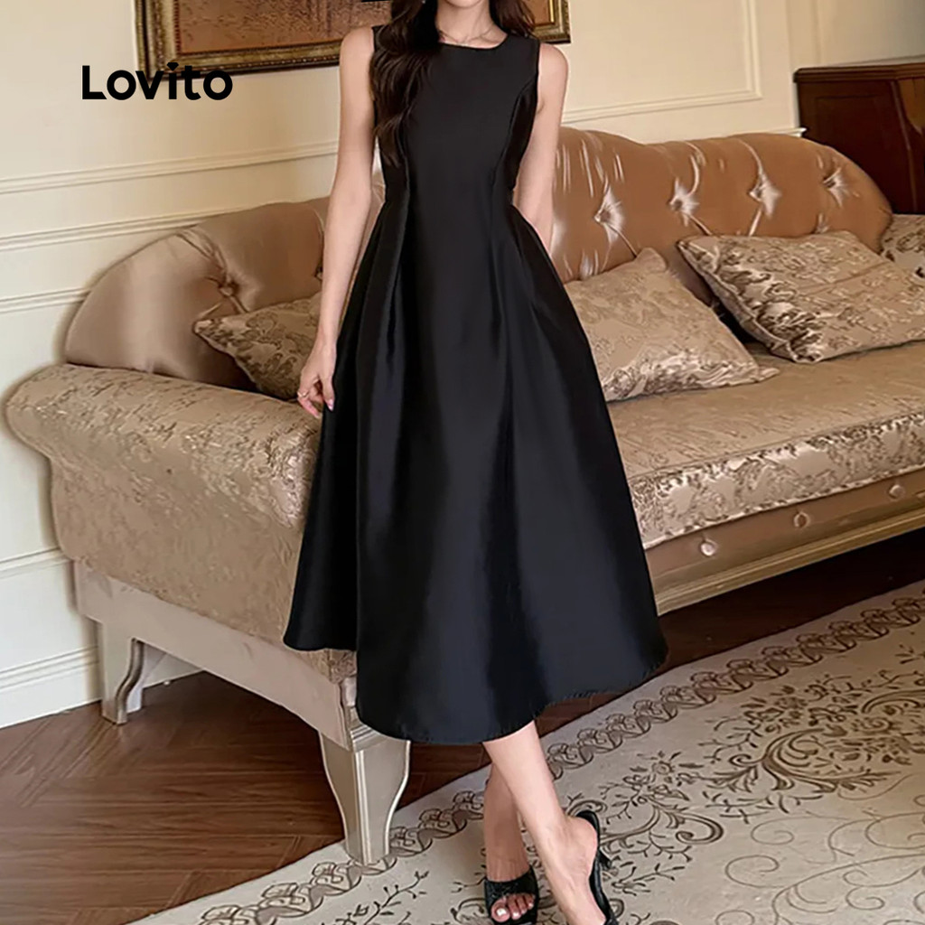 Lovito Vestido Preto com Zíper e Pregas para Mulheres Primavera/Verão L172LD1299