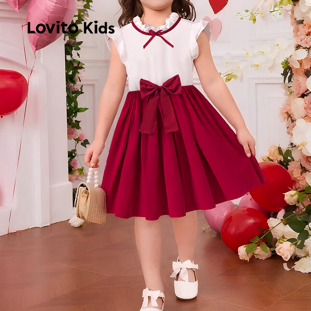 Lovito Vestido Vermelho para Menina com Volante e Laço, Primavera/Verão, Ideal para Natal e Ano Novo L162LD277