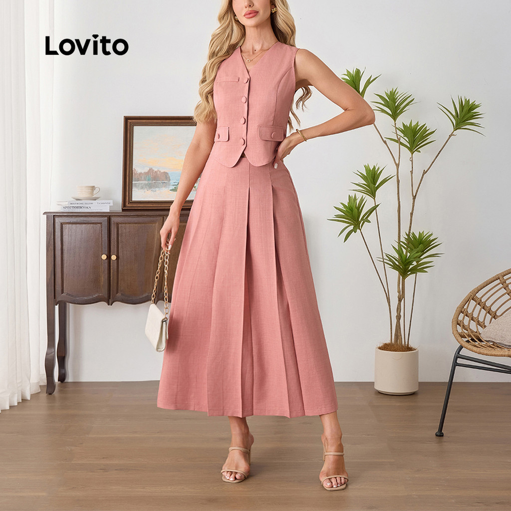 Lovito x Glenda Tops Elegantes Femininos Botões Lisos Plissados Ou Calças De Verão/primavera LBL24158