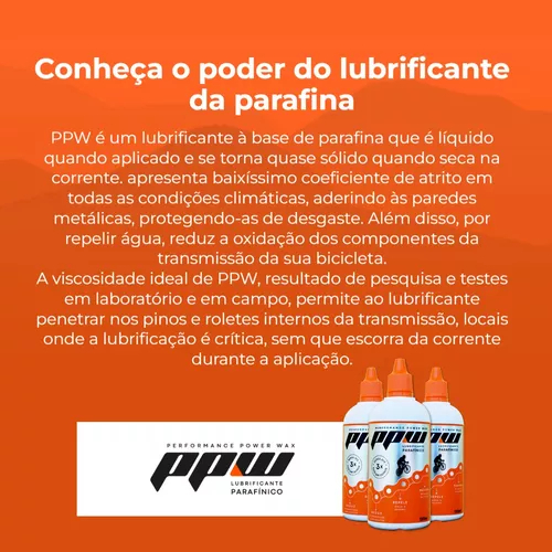 Esse é a melhor cera lubrificante de alta performance para correntes de bicicletas brasileira pois é base de cera parafínica. A única exclusivamente parafínica nacional. Cera base parafínica concentrada de alto poder lubrificante desenvolvida por ciclistas para ciclistas. Fórmula com viscosidade ideal que não pinga mas penetra nos roletes e pinos das correntes formando um filme lubrificante protetor. Por sua capacidade de repelir água a cera parafínica minimiza a coleta de terra, areia e outras impurezas, aumentando incrivelmente a vida útil do sistema de transmissão das bicicletas. As trocas de marcha tornam-se silenciosas e precisas. Uma única aplicação mantém os componentes lubrificados por muitos quilômetros. O resultado é a diminuição do atrito gerado durante as pedaladas, melhorando o desempenho de ciclistas de todos os níveis, mesmo em condições climáticas adversas. *Altamente repelente a água *Aumenta a vida útil da transmissão *Mantém os componentes lubrificados por muito mais tempo. *Trocas de marchas precisas e silenciosas *Melhora o desempenho de ciclistas de todos os níveis Similar aos importados Smoove e Squirt que também são ceras exclusivamente parafínicas. Atenção: Os concorrentes nacionais são, na maioria, ceras de óleos vegetais. Óleos vegetais são contra-indicados para uso em correntes. O PPW lubrificante não contém óleo.