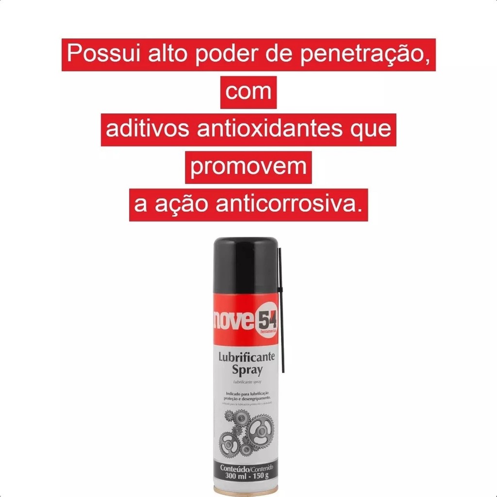 Lubrificante Spray 300ML 150G Até 70°C Com Aditivos Antioxidantes Diferentes Aplicações Vonder - 5164300150 - Possui alto poder de penetração, com aditivos antioxidantes que promovem a ação anticorrosiva. Aplicações e dicas de uso: Indicado para lubrificar e proteger motores, eletrodomésticos, motocicletas, bicicletas, entre outros. Desengripa fechaduras, cadeados, dobradiças e máquinas, também solta partes emperradas como porcas e parafusos, elimina rangidos e repele a umidade. Características: - Marca: Vonder - Modelo: 5164300150 Imagens meramente ilustrativas Especificações: - 300ml - 150g - Limite de temperatura: 70°C Conteúdo da embalagem: - Lubrificante Spray 300ML 150G Até 70°C Com Aditivos Antioxidantes Diferentes
