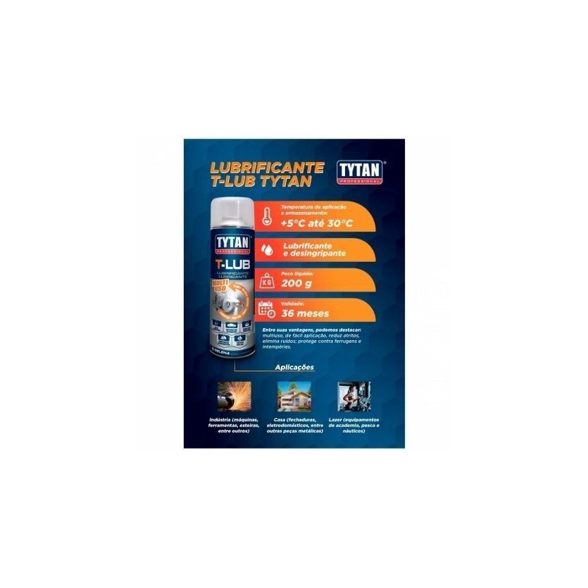 Lubrificante Spray T-Lub é recomendado para o uso geral, reduzir atrito e desgaste entre partes metálicas e eliminar ruídos. Composição livre de solventes, não agride as superfícies mais sensíveis. Fácil aplicação e ajuda a proteger suas peças contra ferrugens e intempéries.
