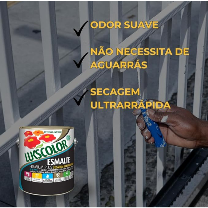 Tinta Esmalte Base Água 3,6litro Lukscolor com Suave Perfume Cor Branco Fosco Com o esmalte base água premium plus Lukscolor, você protege e decora superfícies de madeira e metal, em geral. Conta com um suave perfume que proporciona conforto e bem-estar, permitindo a sua permanência no ambiente do início ao fim da pintura. Disponível nos acabamentos brilhante, acetinado e fosco, para você escolher o que mais combina com o seu estilo. Produto de alta durabilidade e resistência, excelente preservação do brilho, fácil limpeza, não descasca, não amarelece com o tempo e oferece máxima proteção às superfícies. Reduz o tempo de trabalho de pintura, pois possui uma secagem muito rápida. Apresenta ultra rendimento, excelente cobertura e acabamento impecável. Indicação: Madeira, metais ferrosos, aço galvanizado, alumínio, alvenaria, cerâmicas não vitrificada e PVC. Aplicação: Rolo de lã (de pelo baixo), trincha ou pincel de cerdas macias, revólver (pressão de pulverização – 30 a 40 lb/pol²). Diluente: Água potável. Demãos: 2 a 3 dependendo da cor utilizada e do tipo, estado e cor da superfície, pode ser necessário um número maior de demãos. Secagem: Ao toque 1 hora, entre demãos 4 horas, final 4 horas depois da última demão. Recomendações: Manter a embalagem fechada, fora do alcance de crianças e animais; Não reutilizar a embalagem; Armazenar em local coberto, fresco, ventilado e longe de fontes de calor; Manter o ambiente ventilado durante a preparação, aplicação e secagem. Rendimento: Até 75m² por demão.