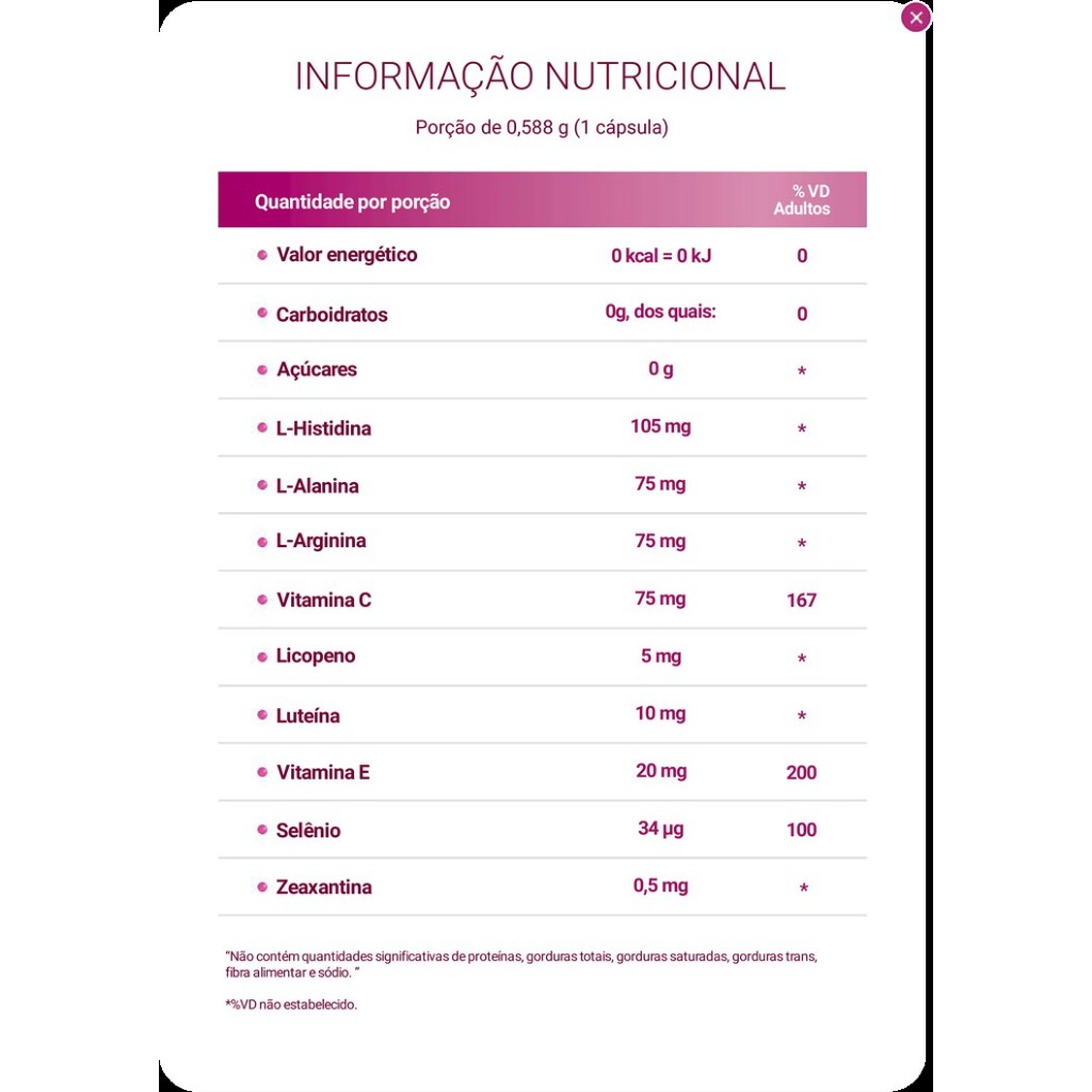 Lumier AOX é um suplemento alimentar em cápsula que combina luteína, licopeno, vitamina E, vitamina C, selênio, L-histidina, L-alanina e L-arginina. A sua composição tem como objetivo proteger contra os danos causados pelos radicais livres, contribuindo para a saúde da pele, cabelo e unhas.