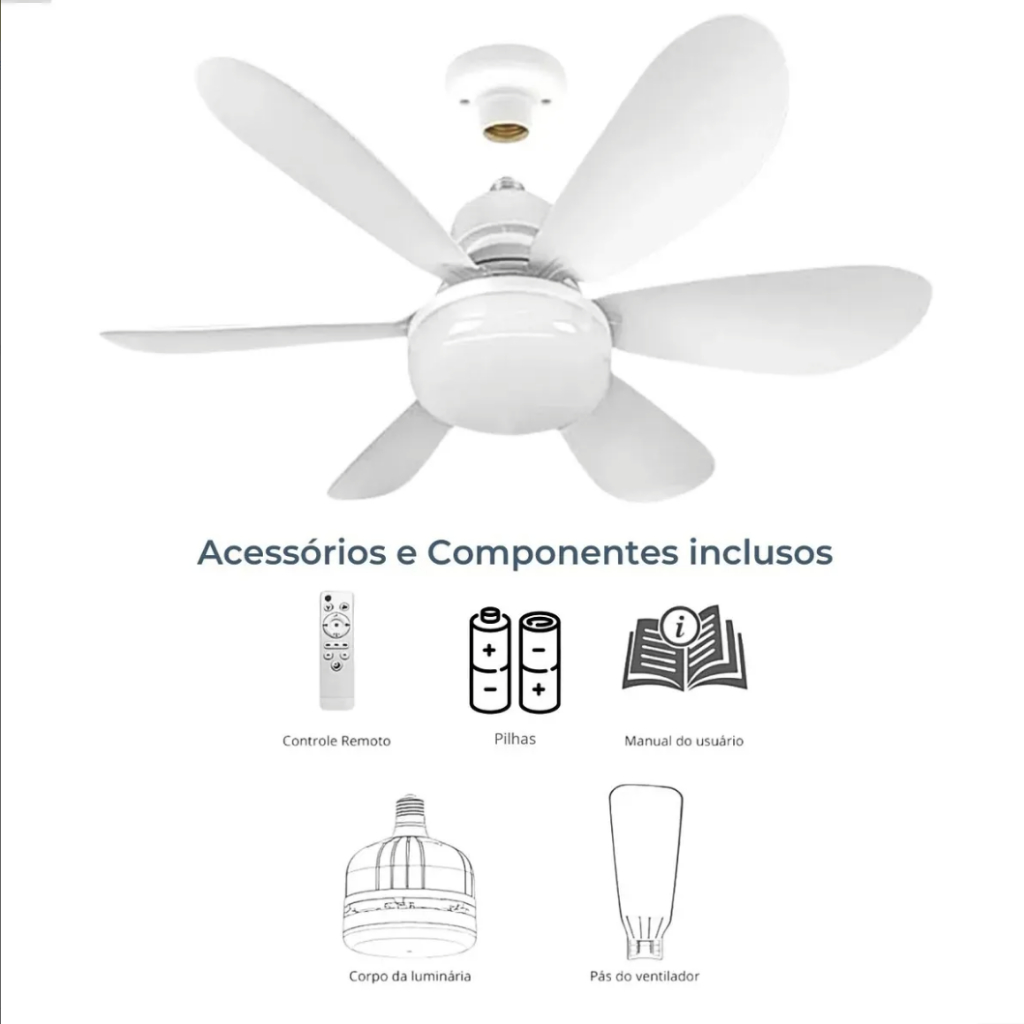 Ventiladores de teto geralmente consomem menos energia comparados a outros tipos de ventiladores e aparelhos de ar-condicionado. 80% de economia real. Oferecem uma distribuição de ar mais uniforme pelo ambiente. Integrados ao design do ambiente, não ocupam espaço extra no chão. Dispensa instalação, basta rosquear em um soquete padrão E27. Bi volt. Único com vida útil de até 50.000 horas. Medidas reais na foto. Controle remoto onde você controla se quer somente ventilador, somente luz e intensidade da luz, e também os dois juntos. O verão chegou, e com ele o calor e falta de arejamento na sua casa, sala, quarto e escritório. Com o Ventilador Potente com Luz Integrada e 6 pás, você pode se livrar do mal-estar e calor no local desejado. O Ventilador Super Potente 6 Pás possui 6 pás, 3 velocidades, 3 modos de ventilação e 3 cores de luz (Branco Frio, Natural e Branco Quente), oferecendo várias possibilidades de uso. Instalação super fácil, já possui luz integrada e o manuseio é simples, podendo ser utilizado de forma portátil. Pacote incluso: 1x Lâmpada LED 6x Hélices 1x Controle Remoto 1x Manual