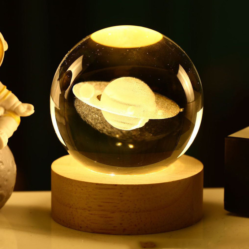 Luminária Abajur Bola Cristal de Mesa Led Globo Vidro 3d Base de Madeira Decoração Presente Tomada