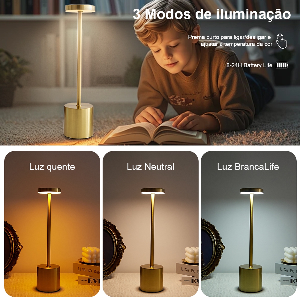 Luminária Abajur Mesa Led Sem Fio Recarregável Led Touch Yesop!!! Feita com materiais duráveis e acabamento refinado, essa luminária combina design minimalista com funcionalidade inteligente, se adaptando a todos os estilos decorativos: desde ambientes modernos e clean até espaços mais aconchegantes e rústicos. Seu tamanho compacto não ocupa espaço extra na mesa, sendo ideal para mesinhas de cabeceira, mesas de trabalho ou escrivaninhas.O belo exterior em forma de haltere e a caixa de metal altamente polido tornam este candeeiro de mesa vintage super elegante, clássico e sofisticado. A praticidade está no interruptor touch sensível: basta um leve toque na base para ligar, desligar ou alternar entre os três modos de luz predefinidos, sem botões complicados. Escolha o modo luz quente (2700K) para momentos de relaxamento, leitura antes de dormir ou jantares íntimos — sua luz amena cria uma atmosfera calorosa e tranquilizante. Para tarefas que exigem clareza, como estudos, trabalho ou leitura detalhada, o modo luz branca (6000K) oferece iluminação nítida, sem cansaço visual. E quando você quer um equilíbrio perfeito, o modo luz natural (4500K) reproduz a luz do dia, deixando o ambiente arejado e ideal para qualquer atividade. LÂMPADA DE MESA COM CONTROLE DE TOQUE: A luminária de mesa LED de metal muda 3 cores de luz (amarelo quente/branco quente/neutro) ao toque e cada cor de luz pode ser ajustada de acordo com suas necessidades sem limitação de luz (escurecimento contínuo). Graças ao seu design simples e de alta qualidade, oferece o toque perfeito para uma luminária de mesa verdadeiramente portátil. ECONOMIA DE ENERGIA E PROTEÇÃO OCULAR: esta luz LED de leitura/luminária de mesa sem cintilação e antirreflexo, o que protege seus olhos e alivia a fadiga ao ler por longas horas. Especificação: Material: ferro Tamanho do produto: 35* 8 cm Tamanho da embalagem: 350* 90 mm Estilo: Dourada Temperatura da cor: (luz branca, luz quente, luz natural) + luz monocromática ilimitada Escurecimento: luz alta e baixa luz ajustável Fonte de luz: LED Bateria de lítio cheia de mAh Tempo de carregamento: 3,5 horas, com luz indicadora de carregamento Vida útil da bateria: cerca de 8-12 horas depois de totalmente carregada