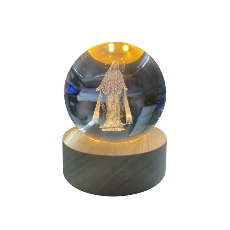 Luminária Abajur Mesa Bola de Cristal Nossa Senhora das Graças 7 cm Luz LED 3D Decorativa Esfera Bivolt Vidro