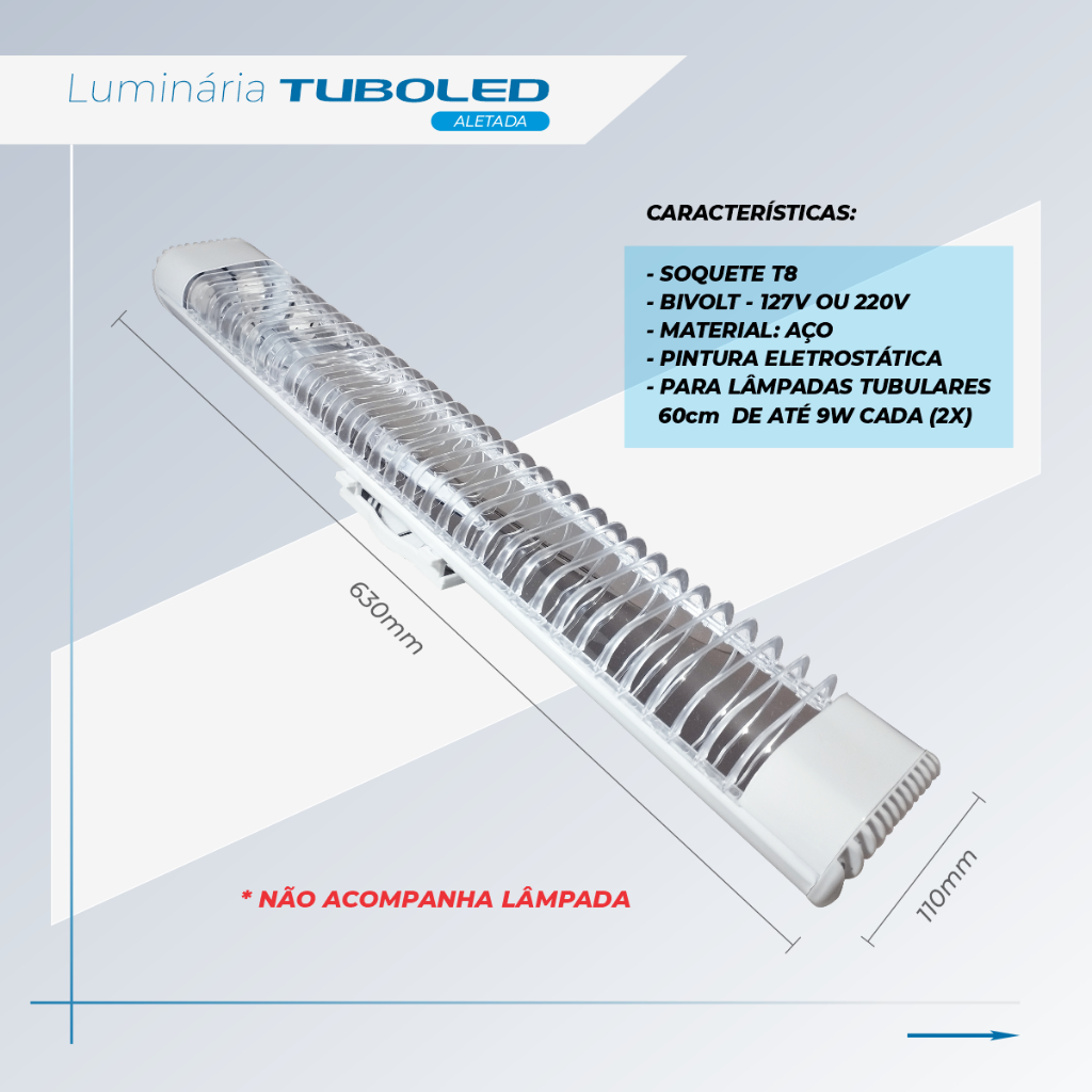 Luminária Aletada 2x9 de calha para Lâmpadas Tubulares até 9W. Iluminação combina eficiência e design funcional para proporcionar uma iluminação uniforme e de alta performance. Projetada para lâmpadas tubulares de até 20W, conta com aletas que auxiliam na dissipação da luz, garantindo maior durabilidade e desempenho. Ideal para aplicações em ambientes comerciais, industriais e residenciais, oferecendo um excelente custo-benefício e fácil instalação. Observações : LÂMPADAS NÃO INCLUSAS Medidas: 63cm X 11 cm Pintura: Eletrostática nas cores Preta ou Branca Embalada com soquetes t8 já encaixados. Acompanha canopla de teto.
