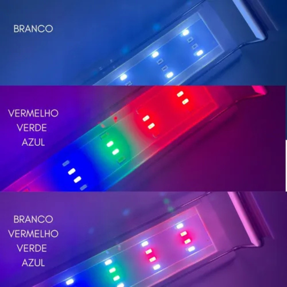 Características: Cores do LED: Branco, Azul e Vermelho (3 cores) Comprimento ajustável: 38 a 50cm Tipo de LED: SMD Material: Alumínio + Vidro Design: Slim, moderno e discreto Alimentação: Bivolt (110v/220v) Fixação: Suportes laterais ajustáveis inclusos Benefícios: Destaca as cores dos peixes e plantas Contribui para o bem-estar aquático com iluminação adequada Estrutura resistente e à prova de respingos Instalação simples e segura