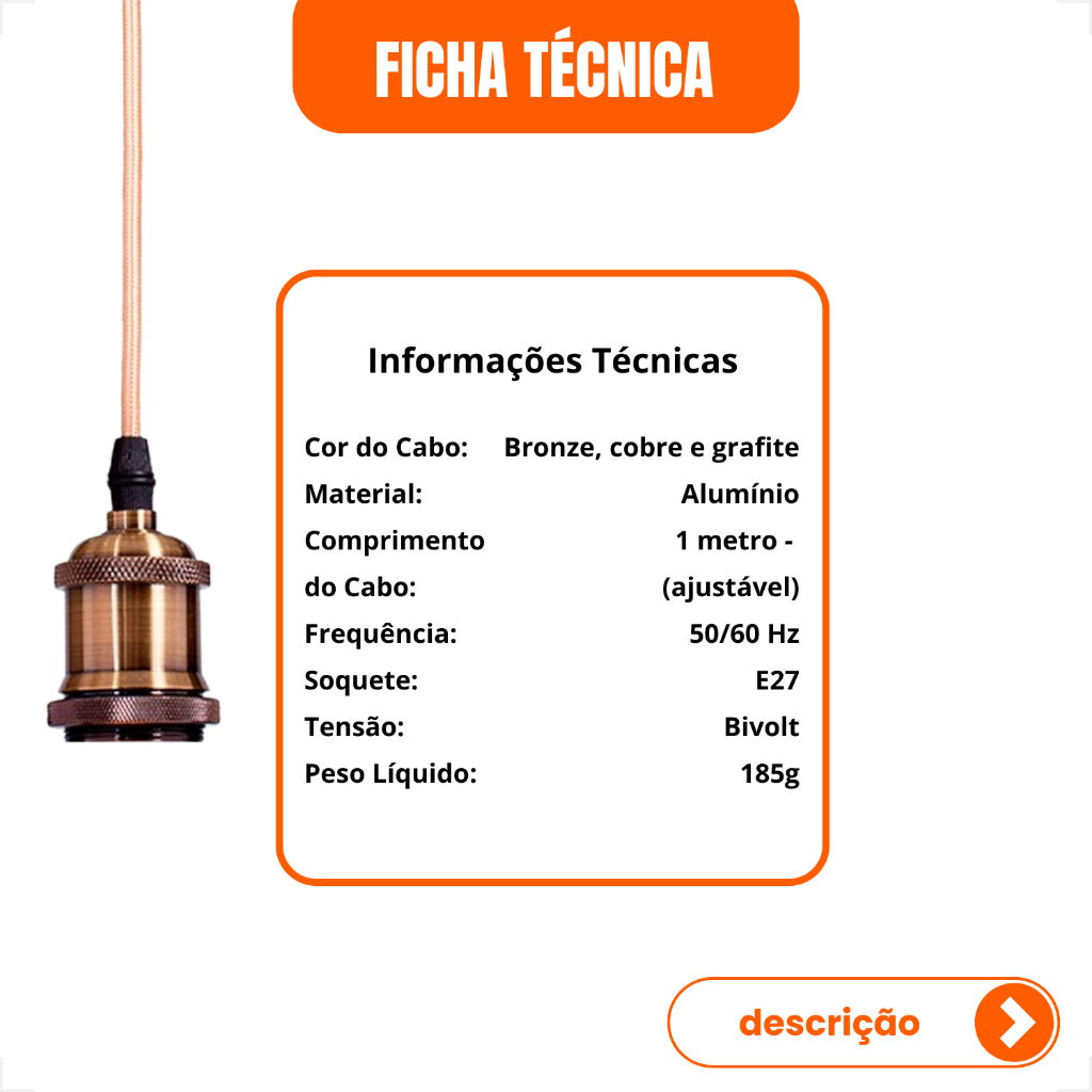 Luminária Cabo Pendente Alumínio E27 1 Metro Ajustável Elegância Sofisticada Cobre Grafite