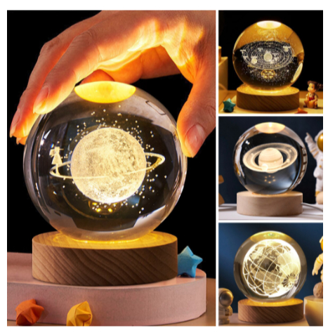 Luminária Cristal De Mesa Planeta Terra Galáxia Sistema Solar LED Base Madeira Enfeite Decorativo Casa