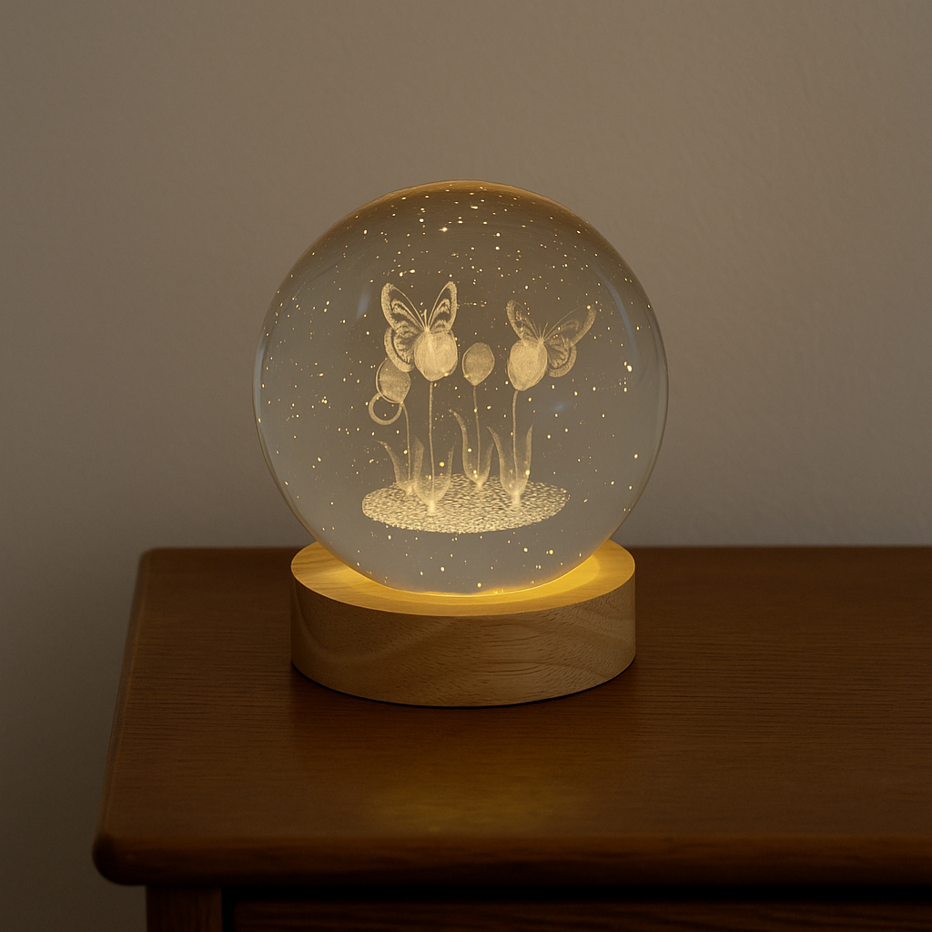 Luminária Crystal Ball 8cm com Base de Madeira – Esfera Iluminada 3D para Decoração
