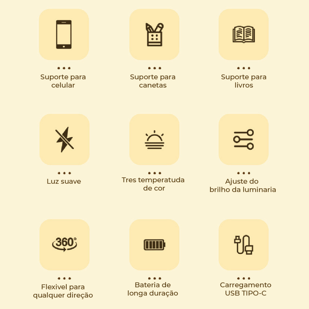 💡 Luminária de Mesa LED – Abajur Escritório | Portátil com Porta-Canetas | Recarregável USB | 3 Tons de Luz 💡 A luminária perfeita para seu escritório ou ambiente de estudo! Com 3 opções de temperatura de cor, bateria recarregável e um design funcional com porta-canetas, ela oferece praticidade e eficiência para o seu dia a dia. Destaques do Produto: • 3 Tons de Luz: Escolha entre Branco Quente (3000K), Branco Neutro (4000K) e Branco Frio (6500K), adaptando a iluminação ao seu ambiente. • Bateria Recarregável: 1200mAh com autonomia prolongada e vida útil de até 30.000 horas. • Design Inteligente: Possui compartimento para armazenar canetas e pequenos objetos, otimizando seu espaço. • Portátil e Prático: Com tamanho compacto de 10 x 10 x 25 cm, é fácil de transportar e usar onde precisar. • Fonte de Alimentação USB: Recarregue facilmente através de qualquer porta USB. • Estilo Moderno: Acabamento branco sofisticado, ideal para qualquer ambiente. Especificações Técnicas: • Cor da Luz: 3000K (Branco Quente) | 4000K (Branco Neutro) | 6500K (Branco Frio) • Bateria: 1200mAh • Vida Útil: 30.000 horas • Dimensões: 10 x 10 x 25 cm • Cor do Material: Branco • Incluso: Luminária, bateria e cabo USB ⚠️ ATENÇÃO: O título "Kit 4" não influencia na quantidade enviada. Escolha a quantidade desejada (1 até 4 peças) nas variações abaixo. 📦 Entrega rápida + Nota Fiscal!