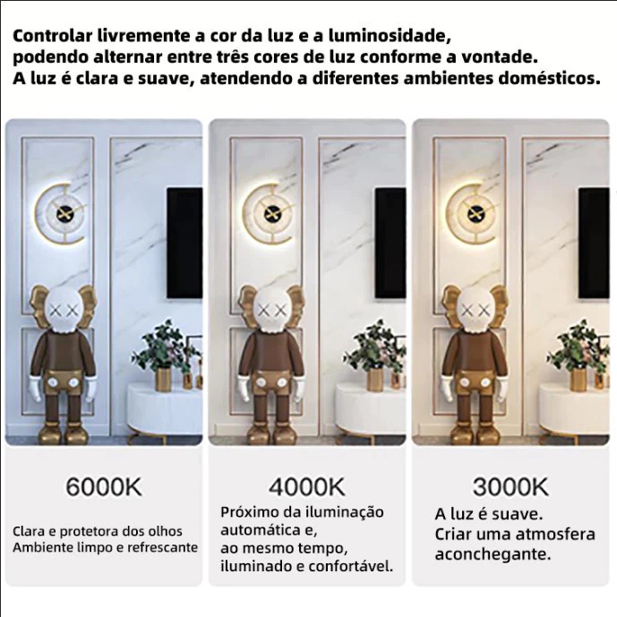 | Luminária de Parede com Relógio LED - 3 Cores de Luz para Quarto e ... este produto | R$ 159,00 | — | 4.5/5 | 33 |