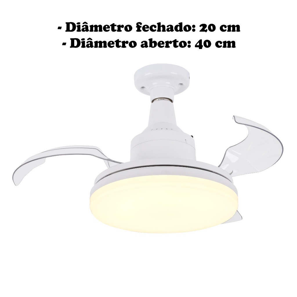 Luminária Aliseu IluminAr, com LED dimerizável de 3 tonalidades, perfeita para todos os momentos da sua rotina. Possui ainda um circulador de ar para manter o seu ambiente arejado e controle remoto, para comandar todas as funções da peça. Acompanha um adaptador E27, facilitando a instalação. Características Técnicas: - Soquete: E27 - Número de pás: 3 retráteis - Diâmetro fechado: 20 cm - Diâmetro aberto: 40 cm - Altura: 19 cm - Peso: 0,7 Kg - Potência consumida pela luminária: 17W - Potência pelo motor: 11W - Tonalidade da luminária: Ajuste contínuo entre luz quente e luz fria (3000K - 6500K) - Acionamento: Controle Remoto - Voltagem: Bivolt - Garantia: 3 meses