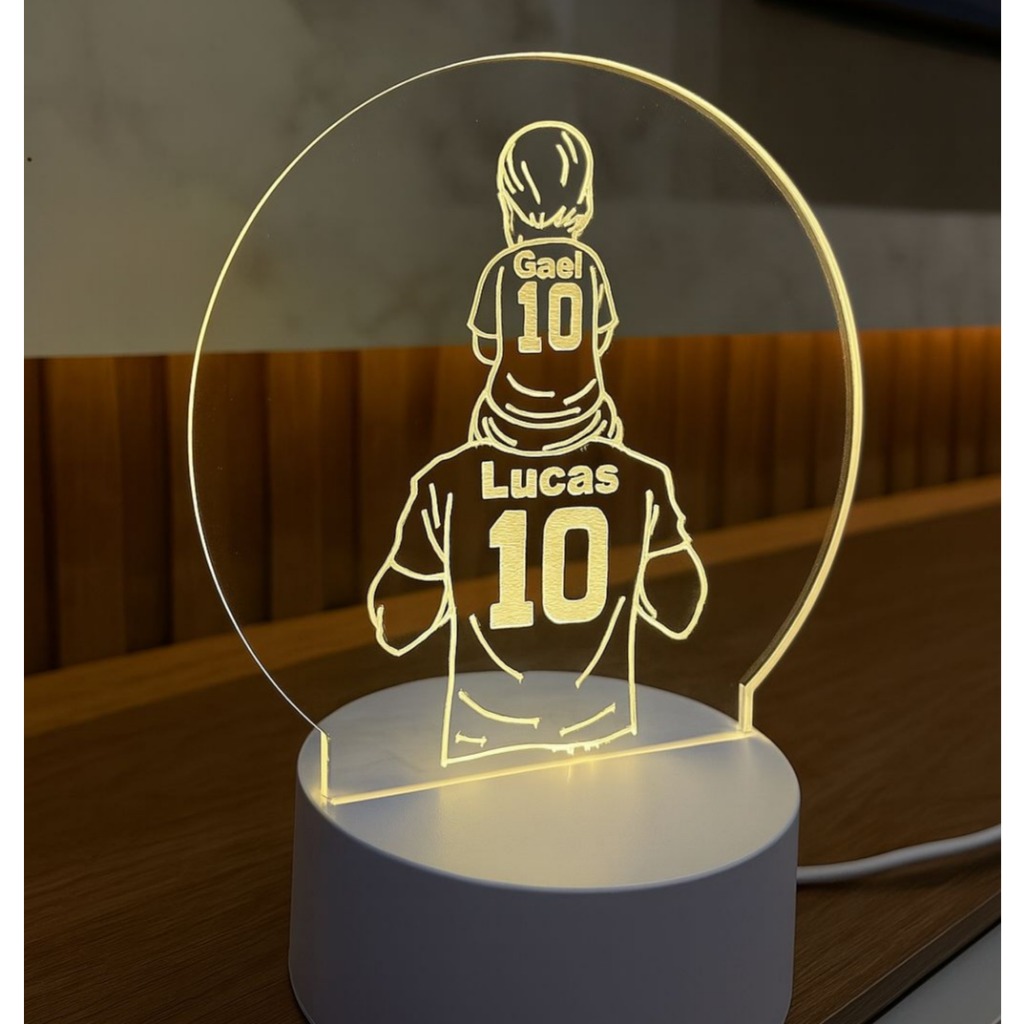 ✨ Luminária LED Personalizada – Pai com Filho(a) | Um presente que brilha amor ! Com design exclusivo, essa luminária personalizada representa o laço especial entre pai e filho ou filha. A peça é confeccionada em acrílico de 3mm com gravação a laser, trazendo a silhueta do pai carregando a criança nos ombros — ambos com camisetas personalizadas com nomes e números que brilham com a iluminação da base LED. ⸻ 🔹 Especificações do Produto: • Material: Acrílico translúcido 3mm com gravação a laser • Base com LED (acompanha cabo USB) • Personalização com 2 nomes e 2 números (um para o pai e outro para a criança) • Medidas da placa acrílica: 12 cm de largura x 12 cm de altura • Altura total com a base: aproximadamente 14,5 cm • Produto leve, elegante e resistente ⸻ 🎁 Presente ideal para: • Dia dos Pais • Aniversário do papai • Homenagem especial de filhos • Decoração afetiva e cheia de significado ⸻ ✅ Diferenciais do produto: • Gravação permanente de alta precisão • Personalização com nomes e números (ex: Lucas 10 / Gael 10) • Brilho uniforme da gravação ao acender a base • Acabamento profissional e duradouro ⸻ 📦 Enviamos com muito cuidado e carinho. Você só precisa nos enviar os dois nomes e os dois números desejados após a compra para a personalização. ⸻ 💡 Surpreenda o paizão com um presente criativo, único e cheio de amor