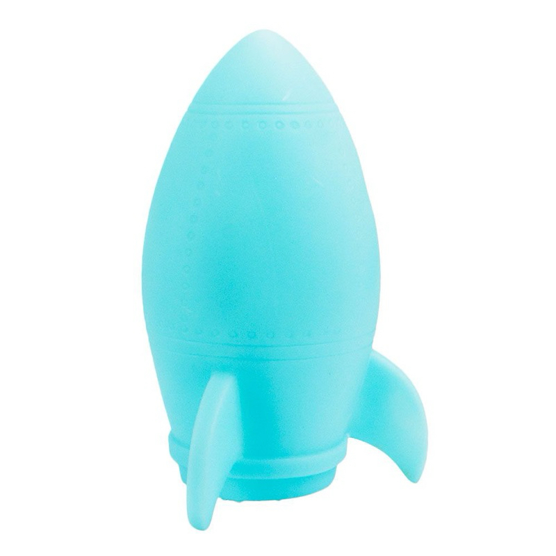 Luminária no formato de um foguete azul de 14 cm de altura. Ao ligar, acende-se luz interna refletindo o foguete. Material: plástico; Funcionamento: 3 baterias LR1130