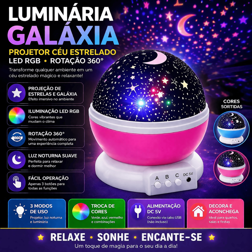 Luminária Galáxia Projetor Céu Estrelado LED Rotação 360° Luz Noturna Infantil Decorativa Estrelas