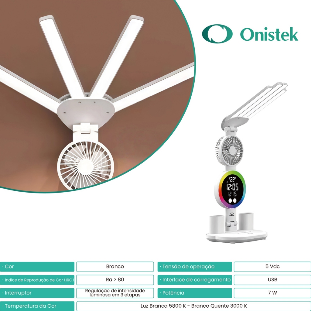 Luminária Grande de Mesa Touch com Ventilador, Relógio e Temperatura – Funcionalidade e Conforto em Um Só Produto Transforme seu ambiente com esta luminária grande de mesa, desenvolvida para oferecer iluminação eficiente e diversas funções em um único equipamento. Ideal para escritório, quarto, home office ou área de estudos, ela une praticidade, conforto e design moderno. PRINCIPAIS CARACTERÍSTICAS: - Luminária de mesa em tamanho grande, proporcionando excelente iluminação para leitura, estudo e trabalho. - Sistema touch, permitindo ligar, desligar e ajustar a luz com um simples toque. - Ventilador integrado, oferecendo ventilação suave e confortável durante o uso. - Relógio digital embutido para facilitar o controle do tempo. - Indicador de temperatura ambiente, trazendo mais comodidade no dia a dia. - Design moderno e elegante, combinando com diversos estilos de decoração. VANTAGENS DO PRODUTO: - Produto multifuncional que reúne iluminação, ventilação e informações essenciais. - Ocupa menos espaço ao substituir vários itens em um só. - Prática, fácil de usar e ideal para uso diário. Perfeita para quem busca mais conforto, organização e eficiência no ambiente. Excelente opção para casa, escritório ou como presente.