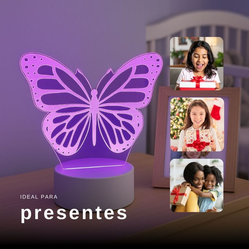 PRESENTE CRIATIVO E DE ÓTIMA QUALIDADE SEU KIT da LUMINARIA INFANTIL MENINA ACOMPANHA: - 1 Base de LED - 1 Projetor acrílico 3mm personalizado - 1 Controle Remoto Touch - 1 Cabo USB (pode ser usado no PC ou fonte de celular) DETALHES: - Possui 16 cores: Alterne facilmente pelo controle remoto incluso - Postagem super rápida: Envio em até 24h após confirmação da compra - Baixo consumo de energia: Economia e eficiência - Fácil de usar: Liga e desliga pelo botão fixado na base - Iluminação de qualidade: Amperagem otimizada para brilho perfeito - Produto de fábrica: Qualidade garantida A luminária cria um incrível efeito 3D de ilusão óptica, resultado da luz integrada em sua base, que se projeta sobre o desenho em acrílico, dando a impressão de um objeto tridimensional iluminado. O impacto visual é surpreendente e encantador! O PRESENTE CRIATIVO IDEAL PARA TODAS AS OCASIÕES! -Luminária Infantil Menina Borboleta de LED – Um Toque de Magia e Doçura para o Quarto da Sua Pequena -Decoração delicada e encantadora para quartos infantis femininos: Torne o cantinho da sua filha ainda mais especial com a Luminária Menina Borboleta. Um item decorativo que une beleza, luz suave e um design meigo com formato de borboleta, ideal para transformar o quarto em um espaço cheio de carinho e tranquilidade. -Presente criativo e cheio de significado para meninas: Seja para aniversário, Dia das Crianças, batizado ou primeira comunhão, essa luminária é a escolha perfeita. Transmite amor, cuidado e é lembrança ideal para filhas, netas, afilhadas e sobrinhas. -Iluminação LED suave para noites tranquilas: A luz aconchegante da luminária infantil ajuda a criar um ambiente seguro e acolhedor durante a noite. Funciona como abajur noturno e traz conforto emocional para a hora de dormir. -Borboletas que inspiram sonhos e leveza: A borboleta representa transformação, pureza e liberdade – símbolos que tornam essa luminária um presente ainda mais especial para meninas em fase de crescimento e descobertas. -Presente perfeito para ocasiões especiais: Encante no Natal, Amigo Secreto, aniversários ou volta às aulas com um presente que vai muito além da decoração. Um mimo iluminado que emociona e marca momentos únicos. -Versatilidade e beleza que combinam com qualquer estilo: A Luminária Menina Borboleta de LED se adapta perfeitamente a diversos tipos de decoração infantil feminina, desde temas delicados até espaços mais modernos ou cristãos. TAMANHO: Altura: 18 cm | Largura: 16,6 cm LUZ SUAVE PARA UM SONO TRANQUILO Desenvolvida com materiais seguros para crianças, nossa luminária proporciona uma iluminação suave, criando um ambiente aconchegante e relaxante. ARTESANAL E EXCLUSIVA Cada peça é produzida com atenção aos mínimos detalhes, resultando em um produto que une arte, amor e funcionalidade. VERSÁTIL E ELEGANTE Com diferentes modos de iluminação, nossa luminária não só decora qualquer ambiente, mas também cria uma atmosfera acolhedora e sofisticada. TRANSFORME MOMENTOS ESPECIAIS EM MEMÓRIAS INESQUECÍVEIS! As luminárias 3D são perfeitas para decorar casas e escritórios, além de serem uma excelente opção de presente. Também são ideais para compor cenários em festas, casamentos, aniversários temáticos e diversas outras ocasiões especiais. Somos fabricantes e oferecemos personalização para eventos com pedidos a partir de 20 unidades. Surpreenda com um presente criativo e personalizado que transmite carinho, afeto e aconchego. PRESENTEIE COM ALUMIA! Garantia do vendedor: 3 meses