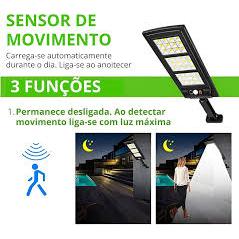 Luminária Led Solar Refletore Poste Rua Sensor 144cob Controle Com 3 Funções 300w (incandescente) Luminária solar com detector de movimento! FUNÇÃO 1: Permanece desligada e acende sua luz máxima sempre que detectar movimento. (recomendado) FUNÇÃO 2: Permanece ligada em luz fraca e acende luz máxima ao detectar movimento. FUNÇÃO 3: Permanece ligada de forma constante em luz média mesmo sem detectar movimento. Luminária solar com detector de movimento e acendimento automático acionada pela intensidade de luz ambiente. Com Autonomia de iluminação de 2h a 4h em luz constante e 12h utilizando sensor de movimento em locais pouco movimentados, grande intensidade de luz, é destinada a áreas externas já que é a prova d´água. Economia, praticidade e segurança em um mesmo produto. Esta luminária ativa quando anoitecer e permanece desligada até o acionamento pelo sensor de movimento, sendo ideal para balizamento de caminhos, jardim, corredores, etc. Operação automática, Desliga sozinha durante o dia e liga, à noite, quando algum movimento é detectado, conforme cada função. Material: ABS+PC Sensor de iluminação: 0,55Watts sensor de luz Solar de Energia: 66/70,4 Watts Fonte de energia: Solar 144 COB 3050 Potencia de iluminação: 300 Watts em incandescente, equivalente à 32w em led bateria: 3.7V 2 peças 18650 *1200 mah Painel Solar: 3.2V 4W proteção em Nível: IP65 Distância de detecção: 4 m Autonomia de iluminação: 2h a 4h em luz constante e 12h utilizando sensor de movimento em locais pouco movimentados tempo de vida do led: 50000 (h) Cor dos Leds: Branco Tipo de instalação: Fixado Na Parede o chão Interruptor: Botão / controle Medidas: 49cm x 13cm x 5cm Sensor de movimento ângulo: 120º Interruptor on/off INCULSO 1 - Luminária Solar de 144cob 2 - Parafusos 2 - Buchas 1 - Manual 1 - Controle remoto Esta luminária ativa quando acionada pelo sensor de movimento, sendo ideal para balizamento de caminhos, jardim, corredores, etc.c