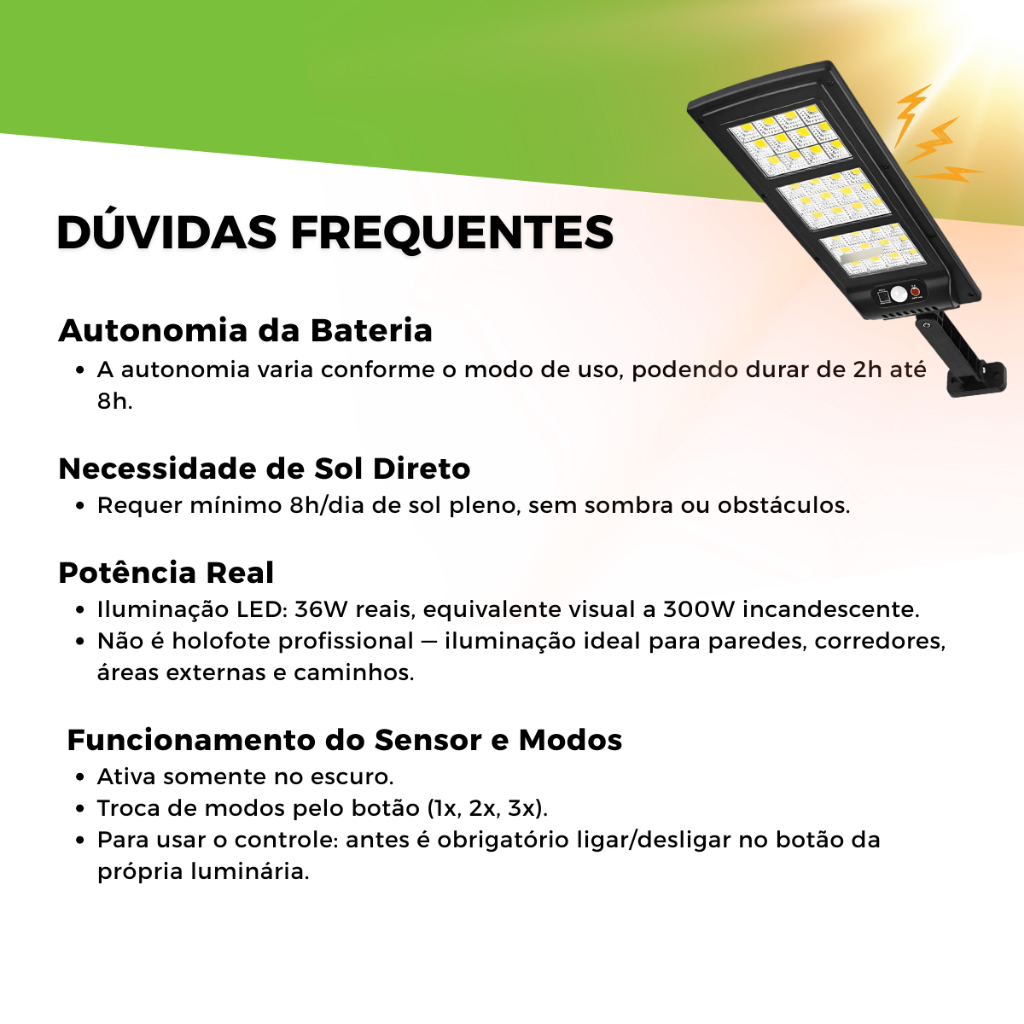 Luminária Led Solar Refletore Poste Rua Sensor 144cob Controle Com 3 Funções 300w (incandescente) Luminária solar com detector de movimento! FUNÇÃO 1: Permanece desligada e acende sua luz máxima sempre que detectar movimento. (recomendado) FUNÇÃO 2: Permanece ligada em luz fraca e acende luz máxima ao detectar movimento. FUNÇÃO 3: Permanece ligada de forma constante em luz média mesmo sem detectar movimento. Luminária solar com detector de movimento e acendimento automático acionada pela intensidade de luz ambiente. Com Autonomia de iluminação de 2h a 4h em luz constante e 12h utilizando sensor de movimento em locais pouco movimentados, grande intensidade de luz, é destinada a áreas externas já que é a prova d´água. Economia, praticidade e segurança em um mesmo produto. Esta luminária ativa quando anoitecer e permanece desligada até o acionamento pelo sensor de movimento, sendo ideal para balizamento de caminhos, jardim, corredores, etc. Operação automática, Desliga sozinha durante o dia e liga, à noite, quando algum movimento é detectado, conforme cada função. Material: ABS+PC Sensor de iluminação: 0,55Watts sensor de luz Solar de Energia: 66/70,4 Watts Fonte de energia: Solar 144 COB 3050 Potencia de iluminação: 300 Watts em incandescente, equivalente à 32w em led bateria: 3.7V 2 peças 18650 *1200 mah Painel Solar: 3.2V 4W proteção em Nível: IP65 Distância de detecção: 4 m Autonomia de iluminação: 2h a 4h em luz constante e 12h utilizando sensor de movimento em locais pouco movimentados tempo de vida do led: 50000 (h) Cor dos Leds: Branco Tipo de instalação: Fixado Na Parede o chão Interruptor: Botão / controle Medidas: 49cm x 13cm x 5cm Sensor de movimento ângulo: 120º Interruptor on/off INCULSO 1 - Luminária Solar de 144cob 2 - Parafusos 2 - Buchas 1 - Manual 1 - Controle remoto Esta luminária ativa quando acionada pelo sensor de movimento, sendo ideal para balizamento de caminhos, jardim, corredores, etc.c
