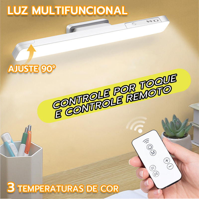 Luminária LED Magnética Recarregável Sem Fio | 3 Cores Dimerizável | Touch + Controle Remoto | Ajuste 90° | USB-C