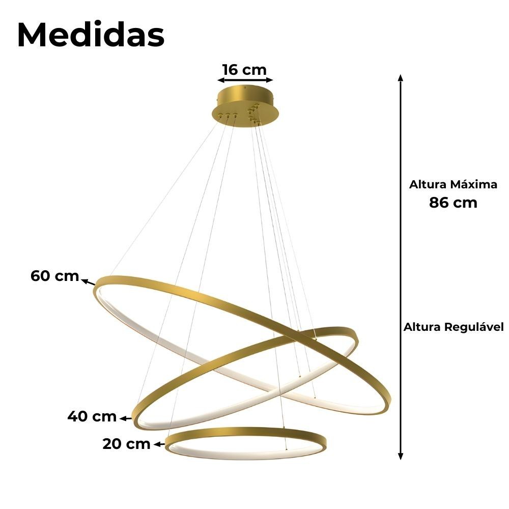 Luminária Lustre Pendente De Teto Moderno Led Orbital 3 Anéis Arcos Dourado Com Cordas Ajustáveis