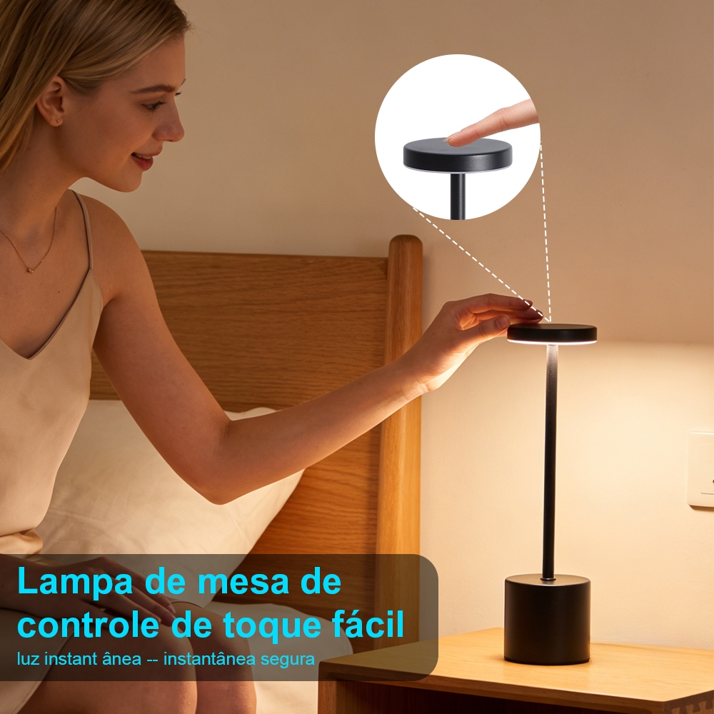 Luminária Abajur Mesa Led Sem Fio Recarregável Led Touch Yesop!!! Feita com materiais duráveis e acabamento refinado, essa luminária combina design minimalista com funcionalidade inteligente, se adaptando a todos os estilos decorativos: desde ambientes modernos e clean até espaços mais aconchegantes e rústicos. Seu tamanho compacto não ocupa espaço extra na mesa, sendo ideal para mesinhas de cabeceira, mesas de trabalho ou escrivaninhas.O belo exterior em forma de haltere e a caixa de metal altamente polido tornam este candeeiro de mesa vintage super elegante, clássico e sofisticado. A praticidade está no interruptor touch sensível: basta um leve toque na base para ligar, desligar ou alternar entre os três modos de luz predefinidos, sem botões complicados. Escolha o modo luz quente (2700K) para momentos de relaxamento, leitura antes de dormir ou jantares íntimos — sua luz amena cria uma atmosfera calorosa e tranquilizante. Para tarefas que exigem clareza, como estudos, trabalho ou leitura detalhada, o modo luz branca (6000K) oferece iluminação nítida, sem cansaço visual. E quando você quer um equilíbrio perfeito, o modo luz natural (4500K) reproduz a luz do dia, deixando o ambiente arejado e ideal para qualquer atividade. LÂMPADA DE MESA COM CONTROLE DE TOQUE: A luminária de mesa LED de metal muda 3 cores de luz (amarelo quente/branco quente/neutro) ao toque e cada cor de luz pode ser ajustada de acordo com suas necessidades sem limitação de luz (escurecimento contínuo). Graças ao seu design simples e de alta qualidade, oferece o toque perfeito para uma luminária de mesa verdadeiramente portátil. ECONOMIA DE ENERGIA E PROTEÇÃO OCULAR: esta luz LED de leitura/luminária de mesa sem cintilação e antirreflexo, o que protege seus olhos e alivia a fadiga ao ler por longas horas. Especificação: Material: ferro Tamanho do produto: 35* 8 cm Tamanho da embalagem: 350* 90 mm Estilo: preto Temperatura da cor: (luz branca, luz quente, luz natural) + luz monocromática ilimitada Escurecimento: luz alta e baixa luz ajustável Fonte de luz: LED Bateria de lítio cheia de mAh Tempo de carregamento: 3,5 horas, com luz indicadora de carregamento Vida útil da bateria: cerca de 8-12 horas depois de totalmente carregada