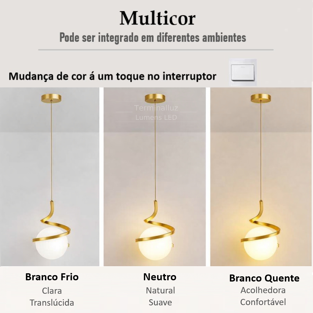 Este modelo com globo iluminado e estrutura em espiral dourada é perfeito para quem quer um ponto de destaque moderno e sofisticado no ambiente. O design em formato espiral envolve o globo, criando um efeito decorativo elegante e uma iluminação suave, ideal para compor salas, quartos, corredores, hall de entrada e cabeceiras. Além do visual diferenciado, o produto conta com sistema de luz tricolor, permitindo alternar a temperatura de cor (quente, neutra e fria) pelo interruptor, trazendo versatilidade para diferentes momentos. Destaques do produto - Design moderno com acabamento dourado e formato espiral - Estrutura em alumínio: resistente, durável, com proteção anticorrosão e antiferrugem - Globo em acrílico: alta transmissão luminosa e difusão suave da luz - ,Luz tricolor: Branco Quente / Neutro / Branco Frio (alternância pelo interruptor) - Cabo ajustável, ideal para diferentes alturas e projetos Medidas - Altura do conjunto: 26 cm - Largura: 19 cm - Base de teto: 10 cm - Cabo: até 1,8 m ajustável Especificações técnicas - Cor: Dourado - Potência: 5W - Soquete: G9 (lâmpada G9) - Material: Alumínio + Acrílico - Tensão: 110V a 220V (bivolt) - Cor da luz: Branco Quente / Neutro / Branco Frio Indicação de uso Recomendado para iluminação decorativa em ambientes internos, como sala, quarto, cabeceira, corredor, hall, lavabo e espaços comerciais, trazendo elegância e um visual contemporâneo.