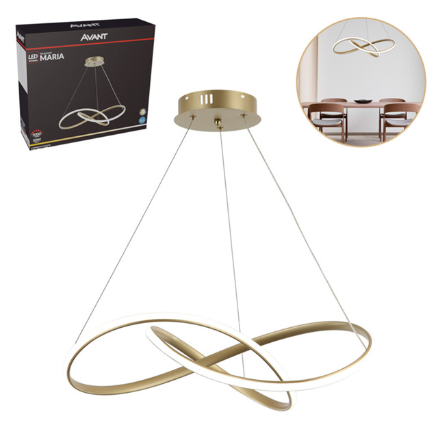 Pendente Maria - Avant O Pendente Maria da Avant é uma peça que combina elegância e modernidade, ideal para quem deseja adicionar um toque especial aos ambientes. Com um design distinto e linhas refinadas, ele se destaca em qualquer espaço, seja na sala de jantar, na cozinha ou em áreas de estar. Propriedades: Potência: 50W Material: Alumínio Temperatura de cor: 3000k ~ 6500k (com chave seletora) Disponível na cor: Dourado Características de Funcionamento: Frequência: 50-60Hz Tensão Nominal: 100-240 Bivolt automático Eficiência luminosa: 100 lm/W Índice de Proteção: IP20 Fator de potência: >0.5 Especificações Técnicas e Comerciais: Código: 589228073 Descrição: LED-PENDENTE-MARIA-50W-3000K-6500K-DO Código de Barras: 7899452043160 Potência: 50W Temperatura de Cor: 3000K~6500K Fluxo Luminoso: 5000 lm Dimensões: A: 1170mm, B: Ø170mm, C: 650mm Peso: 2100g O Pendente Maria possui Garantia Oficial Avant de 24 meses para defeitos de fabricação. Sobre a Avant: A Avant é uma empresa líder em iluminação LED, comprometida em oferecer produtos de alta qualidade, design inovador e eficiência energética. Com foco na sustentabilidade e na satisfação do cliente, a Avant busca criar soluções luminosas que transformam os ambientes e inspiram novas ideias.