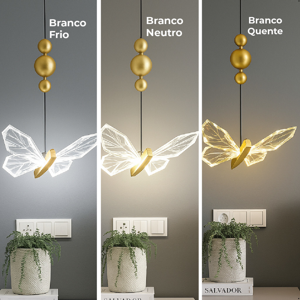 Luminária Pendente Lustre Borboleta de Luxo Cristal Dourada Moderna 3 Tons de Luz Bivolt