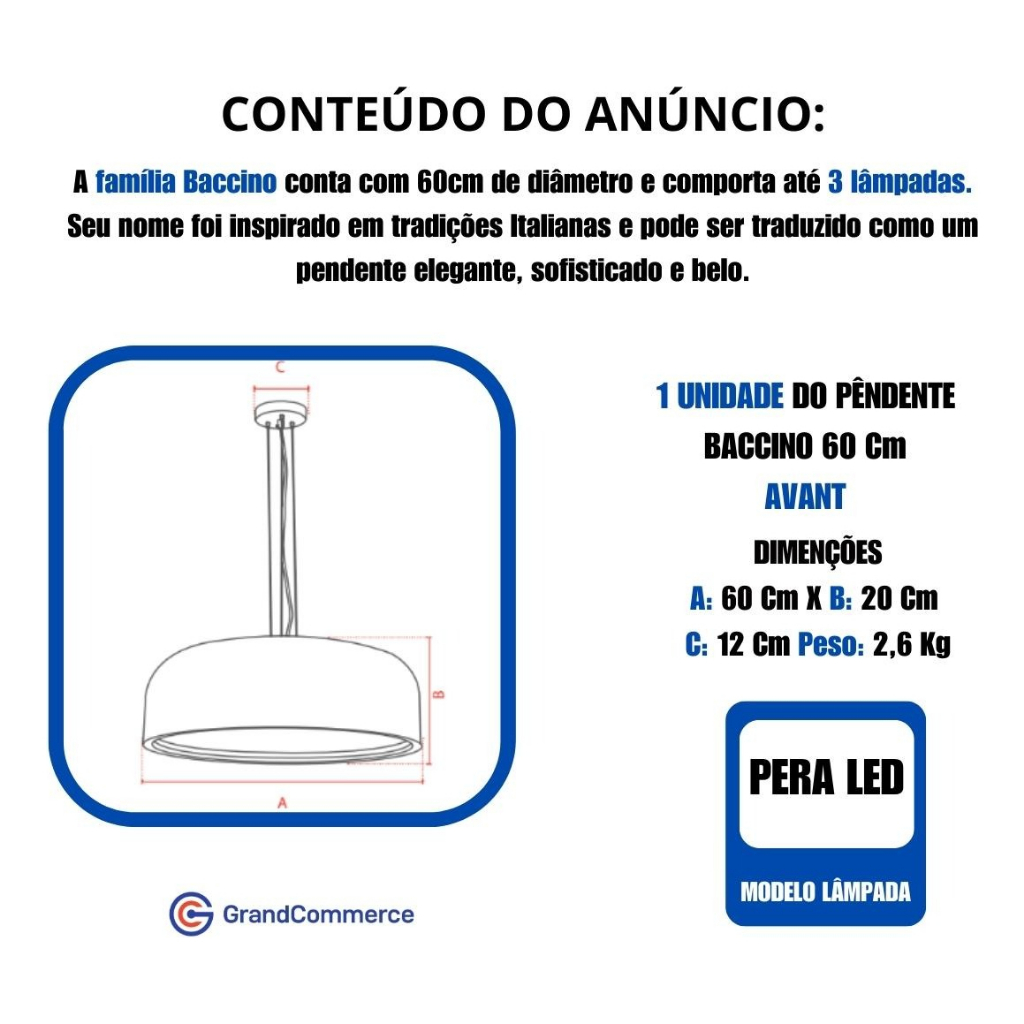 Lustre Pendente sala de jantar Baccino Marsala Avant Produto Novo, 100% original e disponível a pronta entrega para todo Brasil. O Pendente Baccino é ideal para quarto ou sala de estar, perfeito como luminária decorativa, conta com 60cm de diâmetro e comporta até 3 lâmpadas. Disponível com 7 cores marcantes e fortes, possui difusor que não deixa sombras e proporciona maior conforto aos olhos. Seu nome foi inspirado em tradições Italianas e pode ser traduzido como um pendente elegante, sofisticado e belo. Itens inclusos: - 1 Pendente Baccino Alumínio 60cm Base E27 capacidade de 3 lâmpadas - Avant. Sugestões de uso: - Ideal para iluminação interna e decorativa, como quartos, salas de jantar, salas de estar, cozinhas, comércios, clínicas entre outros.. Informações técnicas: - Marca: Avant; - Material: Pendente com uma (1) cúpula em alumínio e canopla em aço; - Cor: Disponível nas cores Nude Brilho, Branco Brilho, Laranja Brilho, Marsala Brilho, Amarelo Brilho, Rosa Brilho e Verde Brilho; - Base: E27; - Capacidade de lâmpadas: 3; - Potência máxima: 3 x 40w; - Dimensões (L x A x L2) mm: 0600mm x 200mm x 0120mm; As dimensões do produto podem variar de acordo com o lote, podendo ser ligeiramente maior ou mesmo menor, sempre mantendo os parâmetros técnicos. - Peso: 2,6 kg; Caracteristicas de Funcionamento: - Cabo ajustável em até 1,5 metro; - Forma: Pendente; - Lâmpada indicada: 3 LED Pera. Benefícios: - Alta qualidade. Garantia: 1 ano.