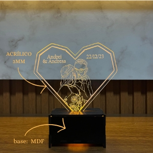 Transforme sua foto favorita em uma lembrança eterna iluminada ✨ Nossa Luminária Personalizada com Foto é produzida com gravação a laser de alta precisão em acrílico, eternizando a imagem do casal, os nomes e a data especial escolhida. Um presente único, romântico e cheio de significado. 💑 Personalização Completa ✔ Foto do casal gravada a laser ✔ Nome personalizado ✔ Data especial (namoro, noivado, casamento ou outro momento marcante) ✔ Enviamos a arte para aprovação antes da gravação ⸻ ✨ Detalhes do Produto 🔸 Acrílico: * 12 cm de altura * 12 cm de largura * Gravação a laser com acabamento delicado e sofisticado 🔸 Base Premium em MDF Laminado: * 5 cm de altura * 4,5 cm de profundidade * 8 cm de comprimento * Encaixe preciso * Iluminação LED com linda camada de luz 🔸 Alimentação: * Funciona com pilhas moeda LR41 * Botão liga/desliga localizado na parte inferior da base ⸻ 💡 Por que escolher essa luminária? ✔ Presente perfeito para Dia dos Namorados, aniversário de namoro, casamento ou surpresa romântica ✔ Decoração sofisticada para quarto ou sala ✔ Produto exclusivo feito sob encomenda ✔ Acabamento premium Envie sua foto após a compra, nós transformamos em arte e enviamos para sua aprovação antes da produção ❤️ Surpreenda quem você ama com um presente iluminado de emoção! ✨