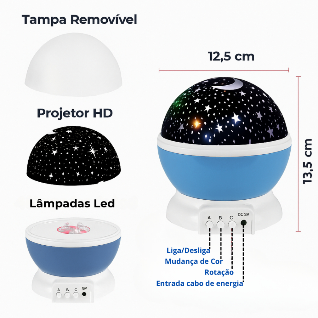🌙 Luminária Giratória Projetor Estrelas – Transforme Qualquer Ambiente em um Céu Estrelado Imagine adormecer sob um céu repleto de estrelas, com a lua girando suavemente acima de você. A Luminária Giratória Projetor Estrelas vai muito além de um simples abajur: ela convida ao relaxamento, estimula a imaginação e cria noites tranquilas e encantadoras. Perfeita para crianças, adultos, casais e ambientes especiais, transforma qualquer espaço em um cenário mágico, acolhedor e relaxante. Por Que Todo Mundo Está Apaixonado por Essa Luminária? 🔹Projeção 360º Giratória 🔹Estrelas e lua se movem pelo teto e paredes, criando um espetáculo visual hipnotizante. 🔹LED Multicores 🔹Diversas opções de cores, desde tons vibrantes até suaves, para combinar com cada momento. 2 Modos de Uso 🔹Com cúpula: funciona como abajur tradicional 🔹Sem cúpula: ativa a projeção no teto e paredes ✅ Funciona via USB (cabo incluso) ou com 3 pilhas AAA (não inclusas). ✅ Portátil e Silenciosa ✅ Fácil de transportar e com motor super silencioso, sem ruídos incômodos. ✅ Desperta Emoções ✅ Relaxa, acalma e transforma o ambiente em um verdadeiro refúgio aconchegante. ✅ Presente Ideal ✅ Perfeita para aniversários, chá de bebê, Natal ou para surpreender alguém especial. 🔧 Como Usar 🔹Retire a cúpula para ativar o modo de projeção no teto 🔹Utilize os botões para selecionar cor, rotação e intensidade da luz 🔹Conecte via USB ou utilize 3 pilhas AAA ❓ Perguntas Frequentes 🔹1. Projeta bem em ambientes iluminados? Funciona melhor em ambientes escuros. Quanto menor a luz externa, mais intenso o efeito. 🔹2. É barulhenta? Não. O motor de rotação é extremamente silencioso, ideal para relaxar ou ajudar crianças a dormir. 🔹3. Acompanha controle remoto? Não acompanha controle remoto, mas é muito fácil de operar pelos botões na base. 🔹4. Pode ficar ligada a noite inteira? Sim, quando conectada via USB. No uso com pilhas, recomenda-se desligar após o uso para economizar energia. 🔹5. Serve para qualquer idade? Sim! Encanta bebês, crianças e adultos, sendo também uma linda peça decorativa.