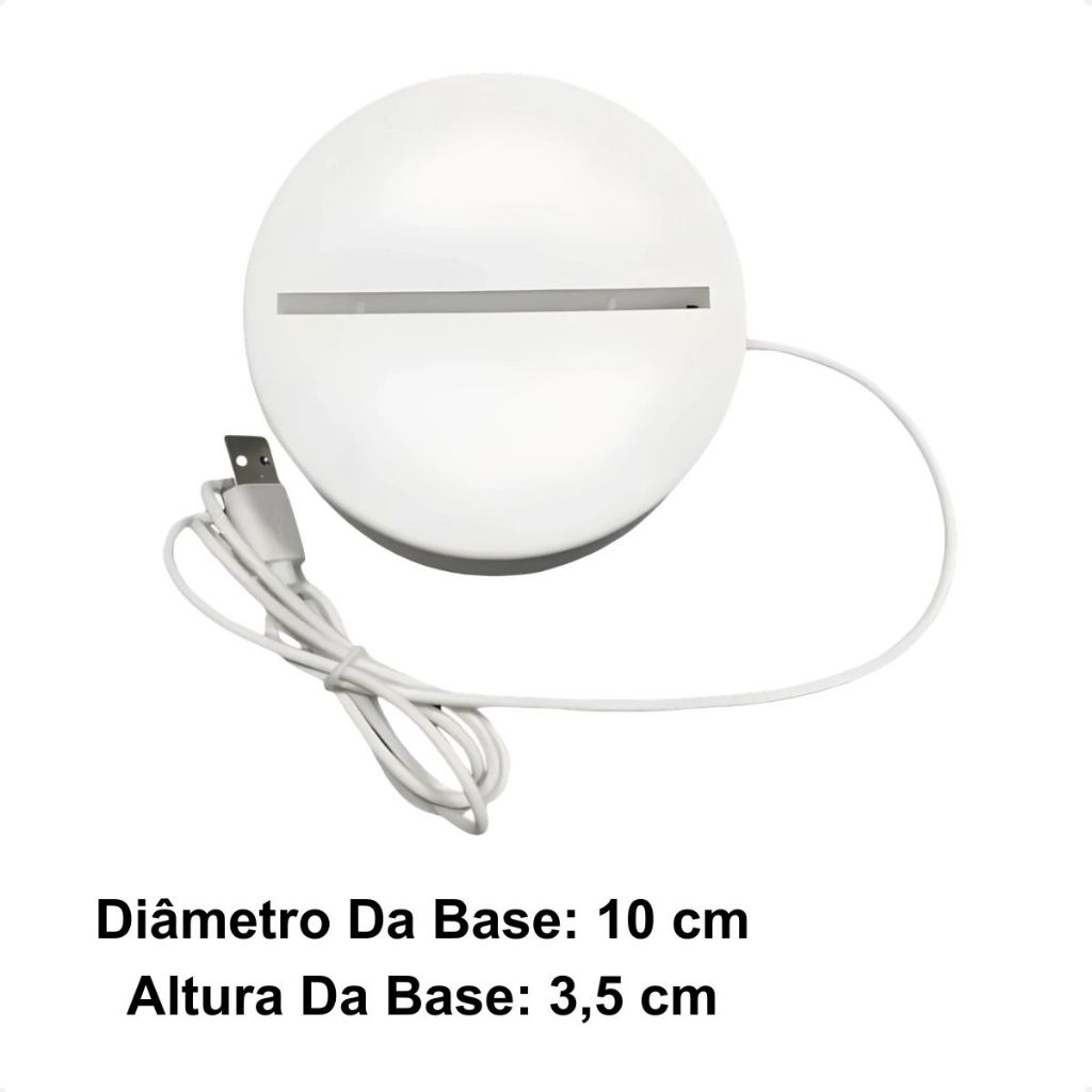 Luminária de Mesa de LED 3D Decore o ambiente com essa linda luminária de led, ela também pode ser utilizada como abajur e lousa de anotações. Luminária feita de acrílico 3 mm, sua base é feita de plástico e led na cor branca. Alimentada por cabo USB. Medidas Totais: 19,5x10 cm Diâmetro da Base: 10 cm Altura da Base: 3,5 cm Fonte de Alimentação: cabo USB (incluso) OBS: Produto segue com película de proteção que deve ser retirada para utilização do produto e satisfação completa Itens Inclusos: 1- Abajur 3d 1 - Cabo Usb 1 - Base 1- Lousa Acrílico Liso (BRINDE) 1- Caneta/Apagador (BRINDE)