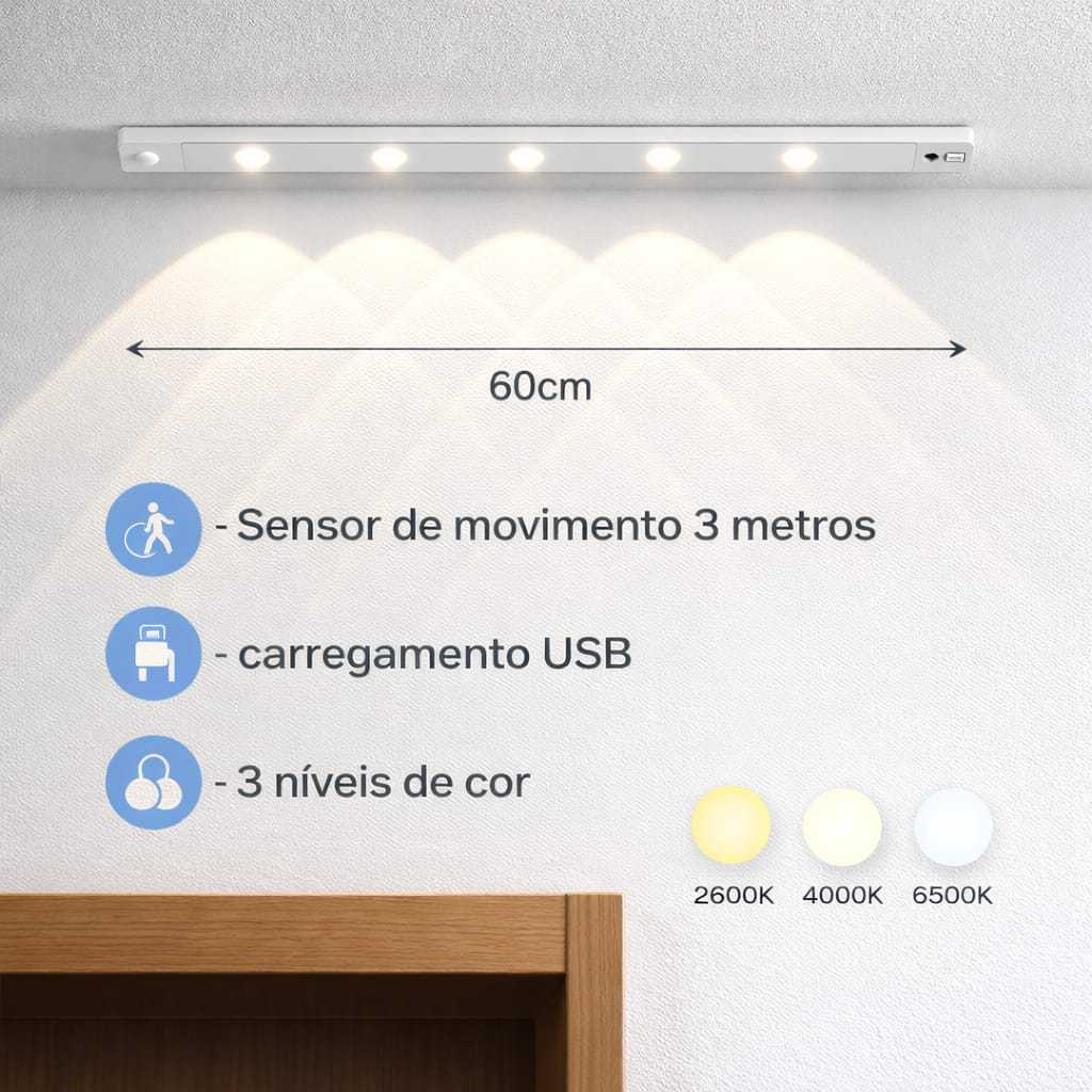 Transforme qualquer ambiente da sua casa com praticidade e um toque moderno. A barra LED com 5 lâmpadas é ideal para quem busca uma iluminação eficiente e funcional. Possui carregamento via USB e bateria com duração de até 30 dias, oferecendo mais autonomia no dia a dia. Conta com 3 tons de luz, permitindo ajustar a iluminação conforme a necessidade, além do modo de luz constante e sensor de movimento com alcance de até 3 metros, trazendo mais comodidade e economia. Versátil, pode ser utilizada em diversos ambientes como cozinha, sala, corredor, quarto, banheiro ou até dentro do guarda-roupa, iluminando bem e deixando o espaço mais aconchegante e com um visual moderno. A instalação é simples e rápida. Acompanha fita dupla face e um trilho que facilita a remoção da barra para recarga. Recomendado carregar por 1 hora antes do primeiro uso para melhor desempenho. Estoque disponível Envio imediato