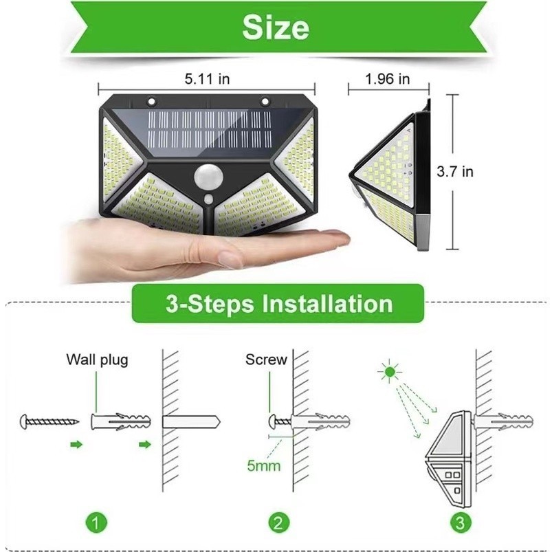 Luminária Solar Parede 100 Led Sensor Presença Com 3 Funções