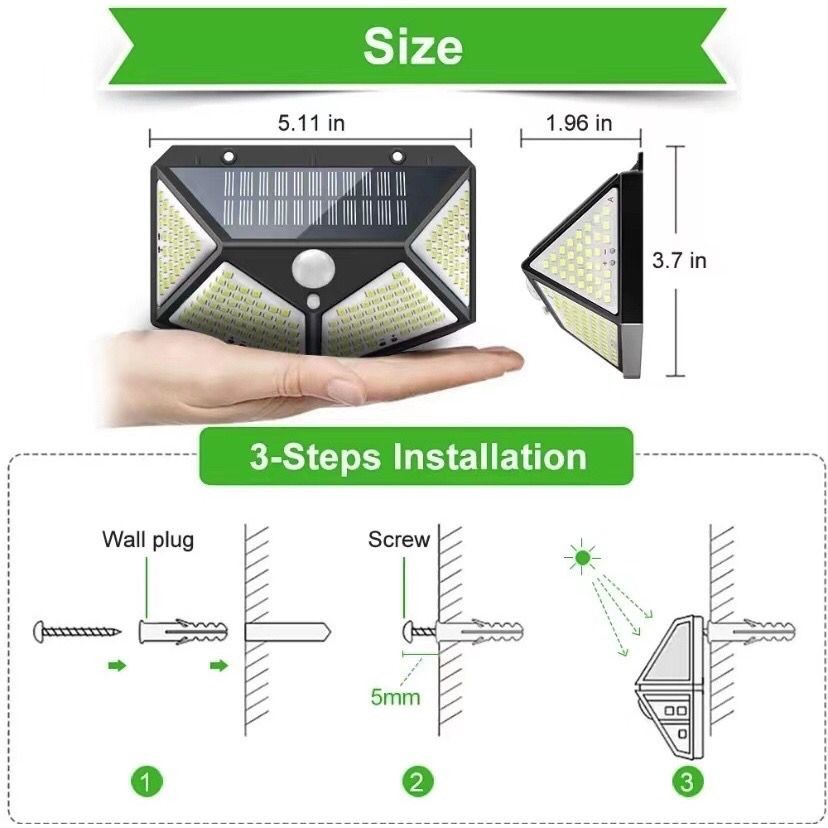 Para maiores unidades, peça a quantidade desejada nas perguntas ! Luminárias Solar Parede 100 LEDs Sensor Presença Com 3 Funções Função 1: Permanece desligada e acende sua luz máxima sempre que detectar movimento. Para ativar, aperte uma vez o botão de ligar.(recomendado, duração da bateria é de aproximadamente 8h); Função 2: Permanece ligada em luz fraca e acende luz máxima ao detectar movimento. Para ativar, aperte duas vezes o botão de ligar. (Duração da bateria vai depender da movimentação do local onde foi instalado, se tiver muito movimento de 2h a 3h, pois ela passa de luz amena para máxima várias vezes, e se não tiver muito movimento pode durar aproximadamente 6h); Função 3: Permanece ligada de forma constante em luz média mesmo sem detectar movimento. Para ativar, aperte três vezes o botão de ligar. (A duração da bateria é de aproximadamente 2h). Luminária solar com detector de movimento e acendimento automático acionada pela intensidade de luz ambiente. É destinada a áreas externas já que é a prova d´água. Economia, praticidade e segurança em um mesmo produto. Esta luminária ativa quando anoitecer e permanece desligada até o acionamento pelo sensor de movimento, sendo ideal para balizamento de caminhos, jardim, corredores, etc. ATENÇÃO: Só irá ascender após o carregamento se não estiver batendo claridade na placa solar! DÚVIDAS FREQUENTES 1. OS PRODUTOS SÃO NOVOS E POSSUEM GARANTIA? Todos os nossos produtos são novos e possuem garantia do revendedor até 90 dias após o recebimento. 2. O PRODUTO TEM GARANTIA? Sim, todos os produtos são vendidos com garantia de até 90 dias após o recebimento pelo revendedor. 3.QUAL É O HORÁRIO DE ATENDIMENTO? De segunda à sexta, das 8:30h às 17:00h. 4.PODE RECEBER CHUVAS? O dispositivo é a prova d'agua já que é destinado para áreas externas, pode receber chuvas. *Em caso de dúvidas, problemas ou questionamentos, pedimos a gentileza de entrar em contato conosco através do campo de mensagens. Especificações: Material: ABS Sensor de iluminação: 0,55Watts Fonte de energia: Raios Solares 100 LEDs SMD2835 Potencia de iluminação: 20 Watts em LED, equivalente a 150 Watts incandescente. Bateria: 3.7V 1 peças X 18650 1200 mAh. Painel Solar: 5.5V 1.43W proteção em Nível: IP65 Distância de detecção: 4 m Tempo Ligada ao detectar movimento: 20 Segundos (Tempo renova a cada novo movimento) Tempo de vida do LED: 50000 (h) Cor dos LEDs: Branco-frio Tipo de instalação: Fixado Na Parede Interruptor: Botão Medidas: 13,5cm x 9,6cm x 5,5cm Sensor de movimento ângulo: 120º Interruptor on/off Itens Inclusos 1 - Luminária Solar de 100 LEDs Kit instalação Manual Parafusos Buchas