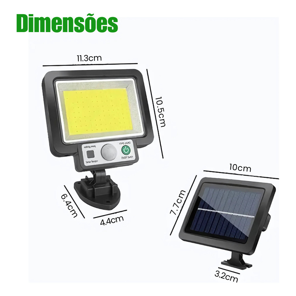 Luminária Solar Parede 117 Cob Sensor Presença Com 3 Funções Função 1: Permanece desligada e acende sua luz máxima sempre que detectar movimento. Para ativar, aperte uma vez o botão de ligar.(recomendado, duração da bateria é de aproximadamente 8h); Função 2: Permanece ligada em luz fraca e acende luz máxima ao detectar movimento. Para ativar, aperte duas vezes o botão de ligar. (Duração da bateria vai depender da movimentação do local onde foi instalado, se tiver muito movimento de 2h a 3h, pois ela passa de luz amena para máxima várias vezes, e se não tiver muito movimento pode durar aproximadamente 6h); Função 3: Permanece ligada de forma constante em luz média mesmo sem detectar movimento. Para ativar, aperte três vezes o botão de ligar. (A duração da bateria é de aproximadamente 2h). - É destinada a áreas externas já que é a prova d´água. - Economia, praticidade e segurança em um mesmo produto. Esta luminária solar para carregar precisa que a placa solar fique totalmente exposta aos raios solares por pelo menos 8h diárias sem qualquer tipo de interferência de sombra, plástico, vidro ou telha entre a placa solar e os raios solares, após o carregamento, ao anoitecer com o cabo da placa solar já conectado na luminária, certifique-se de que não haja claridade batendo na placa solar, e então ligue ela pelo botão embutido na luminária. Lembrando que não é necessário desconectar o cabo para realizar o carregamento. DÚVIDAS FREQUENTES 1. OS PRODUTOS SÃO NOVOS E POSSUEM GARANTIA? Todos os nossos produtos são novos e possuem garantia do revendedor até 90 dias após o recebimento. 2. O PRODUTO TEM GARANTIA? Sim, todos os produtos são vendidos com garantia de até 90 dias após o recebimento pelo revendedor. 4.PODE RECEBER CHUVAS? O dispositivo é a prova d'agua, já que é destinado para áreas externas, pode receber chuvas. Tanto a luminária quanto a placa solar. Especificações: - Material: ABS - Fonte de energia: Raios Solares - LED: 117 Cob - Proteção em Nível: IP65 - Distância de detecção: aproximadamente 4 m - Autonomia de iluminação: 2h a 4h em luz constante e 8h utilizando sensor de movimento em locais pouco movimentados. - Tempo Ligada ao detectar movimento: aproximadamente 20 Segundos (Tempo renova a cada novo movimento) - Tempo de vida do LED e Bateria: 50000 (h) - Cor dos LEDs: Branco Frio - Tipo de instalação: Fixado Na Parede - Interruptor: Botão - Sensor de movimento ângulo: 120º - Interruptor on/off e funções. Itens inclusos: Luminária Solar de 117 Cob; Placa solar com cabo de 5 Metros; Kit instalação - Suportes, parafusos e buchas. Controle remoto Manual. Garantia do vendedor: 90 dias