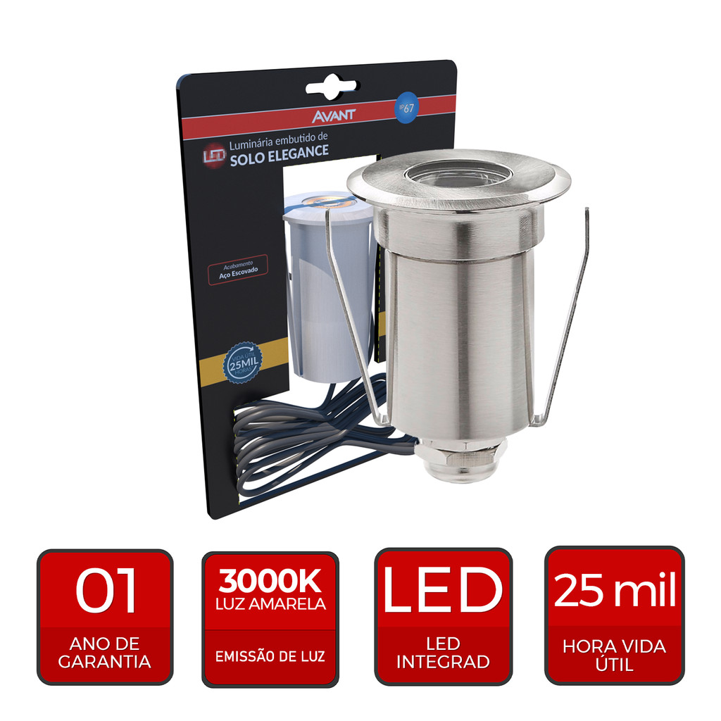 Luminária Solo Elegance - 2W - Aço Escovado - Avant A Luminária Solo Elegance é a solução ideal para ambientes de circulação, tais como, áreas de jardins, corredores e escadarias. Pode ser utilizada perfeitamente em ambientes internos e externos pois conta com índice de proteção IP67. Propriedades: Material: Corpo em aço escovado e lente em policarbonato. Design elegante: Disponível nas cores Preto Fosco e Aço Escovado. Funcionalidade: LED integrado. Características de funcionamento: Iluminação: LED integrado. Temperatura ambiente: -5°C a 40°C. Tensão de entrada: 100V a 240V. Fator de potência: =0,50 (2W) Especificações Técnicas e Comerciais: Código: 337030576 Potência: 2W Fluxo Luminoso: 80 lm Eficiência Luminosa: 40 lm/W Temperatura de cor: AM3000K (Branco Quente) Ângulo de Abertura: 30° IRC: =80 Índice de Proteção: IP67 Tensão: Bivolt Automático (100V-240V) Dimerizável: Não Peso: 114g Dimensões: 70mm x 38mm x 42mm Garantia: 12 meses Sobre a Avant: A Avant é uma marca que oferece soluções inovadoras em iluminação, com produtos de alta qualidade, design moderno e tecnologia de ponta. Com foco na eficiência energética, a Avant busca proporcionar a melhor experiência em iluminação, com foco em durabilidade, performance e economia de energia.