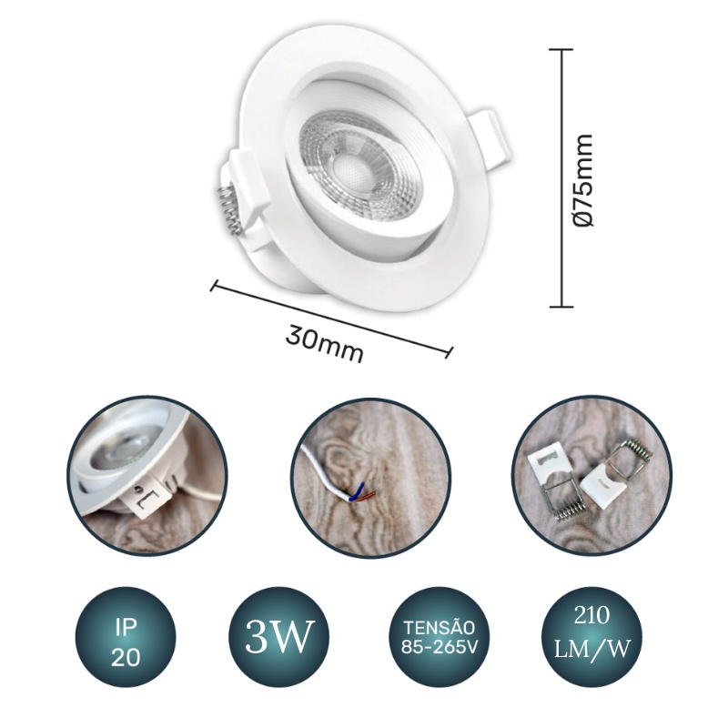Luminária Spot Led Redondo Direcionável 3W Embutir Gesso Teto Preto | Branco Frio | Branco Quente Bivolt Pronta Entrega