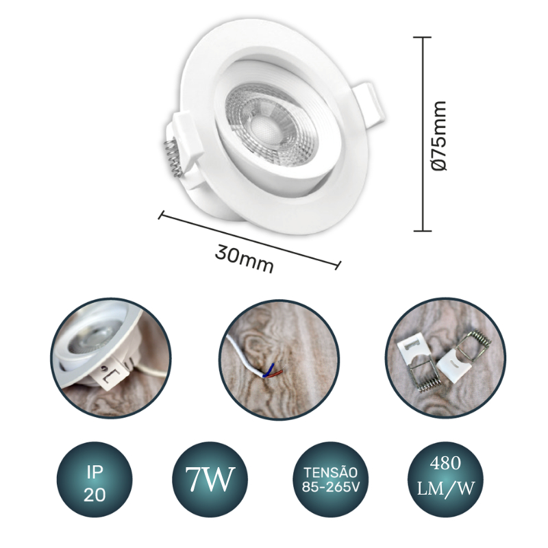 Luminária Spot Led Redondo Direcionável 7W Embutir Gesso Teto |Luz Branca / Luz Amarela Bivolt Spot Super LED