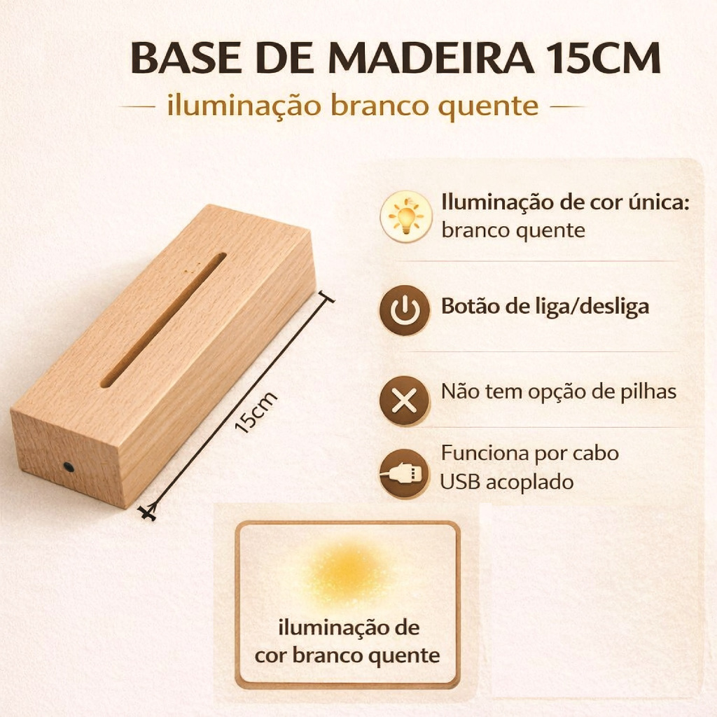 ITEM SEM PERSONALIZAÇÃO Saiba o que está comprando: - Acrílico impresso com tecnologia UltraVioleta (não é adesivo!) Luminária com base LED do modelo escolhido - Base Branca (Luz Branco Quente): Possui somente um fio USB acoplado à base, não possui compartimento para pilhas. Se conecta em carregadores (não incluso) ou entradas para USB - Base Preta e Branca (Luz RGB): Acompanha um cabo USB separado da base LED, e possui compartimento para pilhas 3AA (não inclusas). - Base de Madeira (Luz Branco Quente): Possui somente um fio USB acoplado à base, não possui compartimento para pilhas. Se conecta em carregadores (não incluso) ou entradas para USB