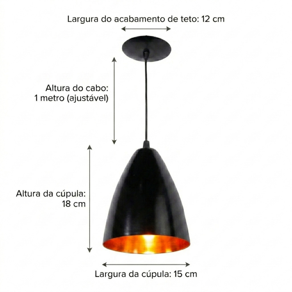 pendente Vegas Kit 2 Preto com Cobre são ótimas apostas para deixar o seu ambiente mais sofisticado e aconchegante. Além disso, uma boa iluminação faz total diferença nos detalhes do ambiente. Você pode coloca-los um ao lado do outro ou separadamente em diversos ambientes. Seu design proporciona facilidade na hora de dar aquela limpeza. Além da praticidade na hora da instalação. Assista o nosso vídeo e você mesmo já conseguirá instala-lo. Tomamos todo cuidado para que nossos pendentes cheguem em perfeito estado. Sempre envolvemos em plástico bolho e utilizamos caixa com a palavra“frágil”. ESPECÍFICAÇÕES Voltagem: 127/220v Bivolt (Depende apenas da lâmpada) Modelo do Soquete: E-27 Modelo do Cabo: PP 2 metros (ajustável) Material da Cúpula: Alumínio Cor: Preto com Cobre Peso:0,800Kg Dimensão da Caixa:25 cm Largura: 15 cm Comprimento: 15cm Altura: 18cm ITENS INCLUSO Cúpula Canópla Cabos Acabamentos GARANTIA 4 meses contra defeitos de fabricação (1 mês de garantia junto ao fabricante, mais 90 dias referentes à garantia legal, nos termos do artigo 26, II, do Código de Defesa do Consumidor).