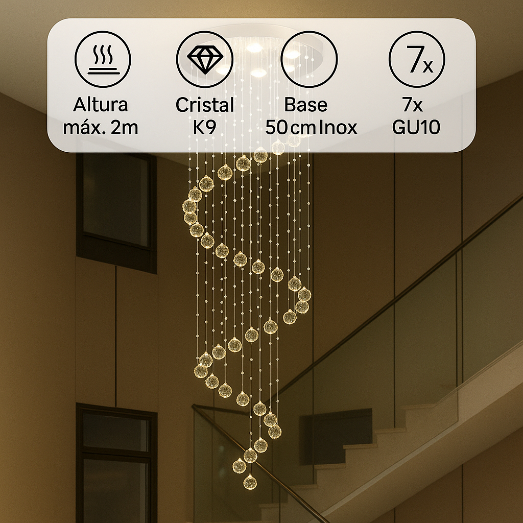 Transforme seu ambiente com um lustre espiral de impacto, ideal para escadas, halls e pé-direito alto. Fabricado com cristais legítimos K9 e base em inox espelhado com acabamento refinado. Especificações Técnicas: Material: Cristal legítimo K9 + Inox espelhado Base: Redonda, 50cm de diâmetro Castanhas: 14mm (K9) Bolas: 78 unidades de 30mm (K9 legítimo) Altura total: Até 2 metros (ajustável) Peso aproximado: 8kg Soquetes: 7 unidades GU10 (não acompanha lâmpadas) Tensão: Bivolt (127V – 220V) Montagem: Parcial (esferas vão separadas para segurança no transporte) Dúvidas Frequentes: O produto vai montado? Vai parcialmente montado. As bolas de cristal devem ser fixadas após a instalação da base. Os cristais são de verdade? Sim, cristal legítimo K9 com lapidação premium. Qual lâmpada usar? Modelo GU10 (LED) – fácil de encontrar. A instalação é difícil? Recomenda-se instalação por profissional. Teste os soquetes antes de fixar a base. Ambientes Recomendados: Hall de entrada, escada com pé-direito alto, sala com mezanino, recepção, entrada de duplex ou showroom.