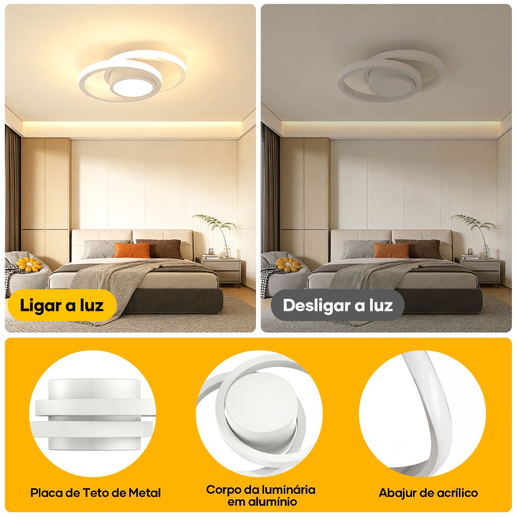 Lustre Plafon LED Moderno Sobrepor Teto Design Anéis 24W Bivolt 3 Cores de Luz Para Sala Quarto Corredo