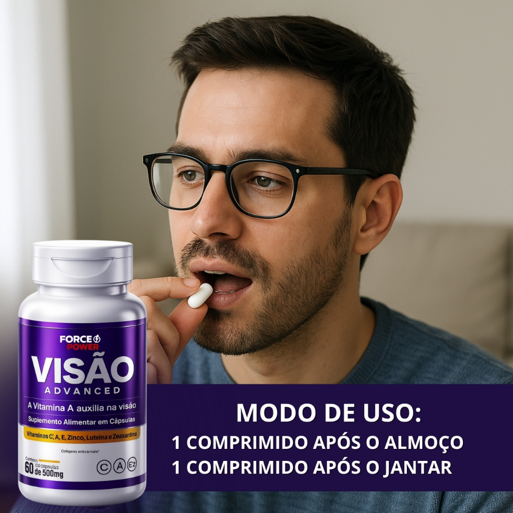 VISÃO ADVANCED FORCE POWER Cada Pote Contém : 60 cápsulas ______________________ INFORMAÇÃO NUTRICIONAL : Porção de 1000 mg ( 02 Cápsulas ) Vitamina A - 2.622 mcg Vitamina C - 90 mg Vitamina E - 20 mg Zinco - 14 mg Cobre - 900 mcg Selênio - 68 mcg Luteína - 20 mg Astaxantina - 4,0 mg Zeaxantina - 3,0 mg NÃO CONTÉM GLÚTEN ______________________ RECOMENDAÇÃO DE USO : Ingerir : 01 cápsula após o almoço Ingerir : 01 cápsula após o jantar _______________________ ADVERTÊNCIAS : Crianças, gestantes, idosos e portadores de qualquer enfermidade devem consultar o médico e/ou nutricionista. Este produto não substitui uma alimentação equilibrada e seu consumo deve ser orientado por um nutricionista e/ou médico. Conservar este produto bem fechado, em lugar fresco e seco, protegido dos raios solares.
