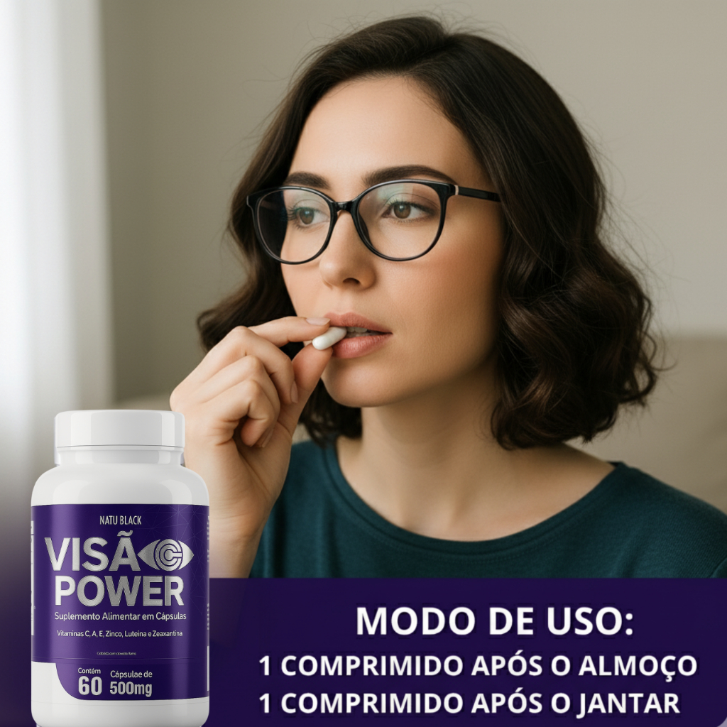 VISÃO POWER NATU BLACK Cada Pote Contém : 60 cápsulas 500 mg _______________ INFORMAÇÃO NUTRICIONAL Porção de 1000 mg ( 02 Cápsulas ) Vitamina A - 2.622 mcg Vitamina C - 90 mg Vitamina E - 20 mg Zinco - 14 mg Cobre - 900 mcg Selênio - 68 mcg Luteína - 20 mg Astaxantina - 4,0 mg Zeaxantina - 3,0 mg ________________ NÃO CONTÉM GLÚTEN! ATENÇÃO: Crianças, gestantes, idosos e portadores de qualquer enfermidade devem consultar o médico e/ou nutricionista. Este produto não substitui uma alimentação equilibrada e seu consumo deve ser orientado por um nutricionista e/ou médico.